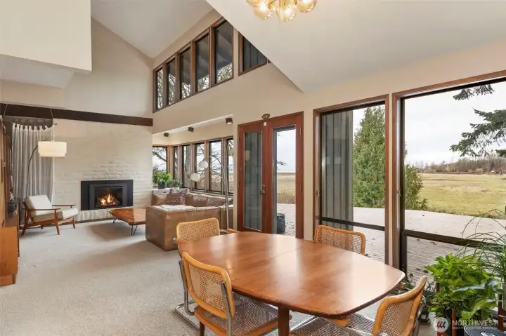 Designed by a prominent PNW architect, this contemporary home offers serene water views and stunning mountain vistas. Just minutes from the Lower Dungeness River—with its trails, fishing, and abundant wildlife—it’s a true bird-watching paradise. The light-filled great room features a cozy propane fireplace and expansive windows that bring the outdoors in, with French doors opening to a new oversized deck ideal for entertaining or relaxing. Upstairs you’ll find three bedrooms and a full bath. Additional features include a sauna, 1-car garage, and an enclosed carport that can serve as a bonus room, workshop, studio, or creative space. 10 minutes from downtown Sequim and all of it's conveniences. A one-of-a-kind retreat style home!