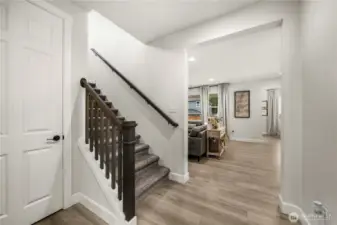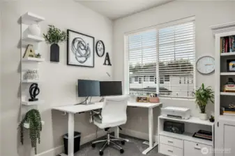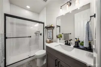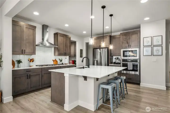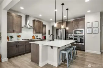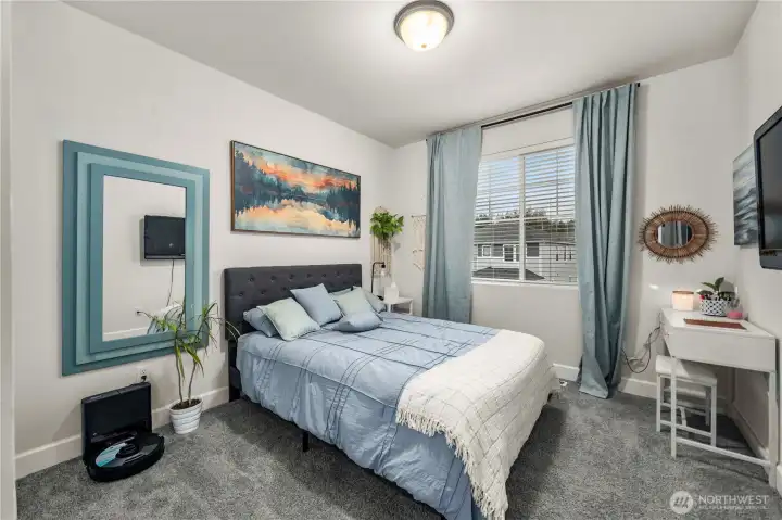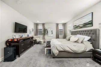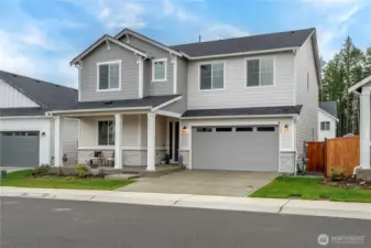 Barely lived in and better than new! This stunning Andrea plan offers a bright great room with fireplace, gourmet kitchen with gas range, walk-in pantry, and sitting nook for the chef to catch a break! Including a spacious dining area, main floor bedroom and ¾ bath with a walk-in shower this home is perfect for multigenerational living. Upstairs, a custom theater room awaits-complete with built-ins, furnishings and equipment if desired. Retreat to the luxurious primary suite with an oversized closet and tiled spa bath, plus 2 additional bedrooms and laundry with added cabinetry. EV charger, new appliances, and covered patio included-fully fenced and ready for move-in!