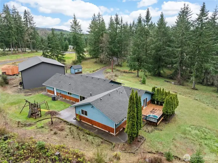 Imagine finally finding the perfect property with something for everyone. This single-level, 4-bedroom home (3-bed septic), 2-bath sits on five private acres, offering an amazing country feel while remaining conveniently close to town. Open-concept kitchen, dining, and living area, ideal for everyday living and entertaining. A separate living room with a cozy pellet stove, located near two of the bedrooms, creates the perfect space for movie nights or relaxing evenings at home. Truly impressive 40’x48’ shop features four doors—two 8-ft doors, one 14-ft door, and one 16-ft door—and includes a mezzanine level for additional storage or hobby space. Even more storage is available with a separate insulated 14 x 14 shed.