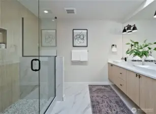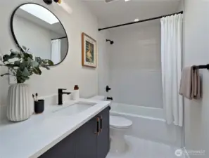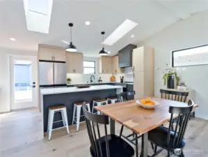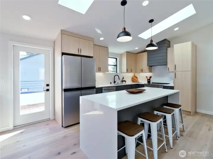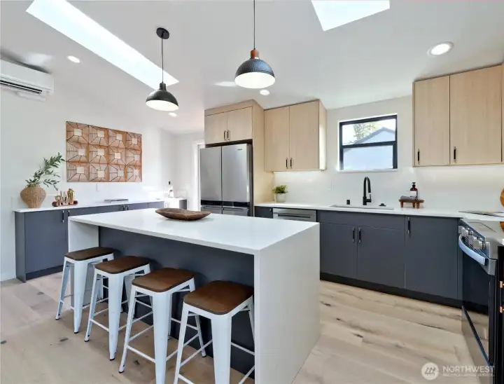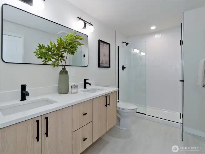 Welcome to your Fully Remodeled Dream Home in West Seattle! Bright and open-concept main level with wide-plank engineered hardwood floors & designer finishes. The massive kitchen is a true centerpiece featuring quartz countertops, a large center island & custom cabinetry all bathed in natural light from large windows & skylights. Four generously sized bedrooms, including a luxurious primary suite w/ spa-inspired bathroom featuring heated floors, a double vanity, and large walk-in shower. Downstairs, the fully finished lower level provides flexible space for a media room, home gym, etc. 2 additional bedrooms, 3rd bathroom and laundry room complete this level. 1 Car Covered Parking. Large, dry storage room under the deck.