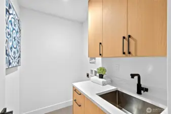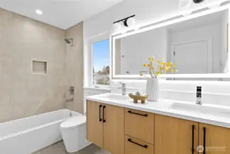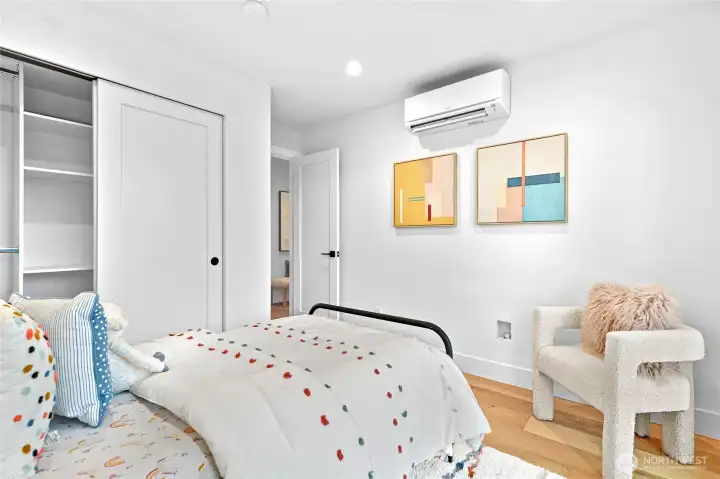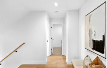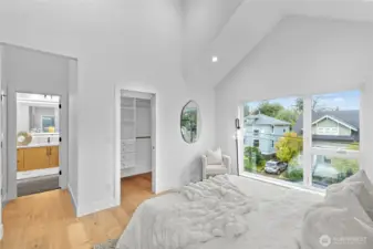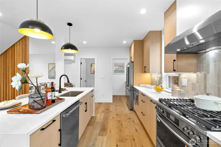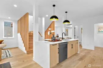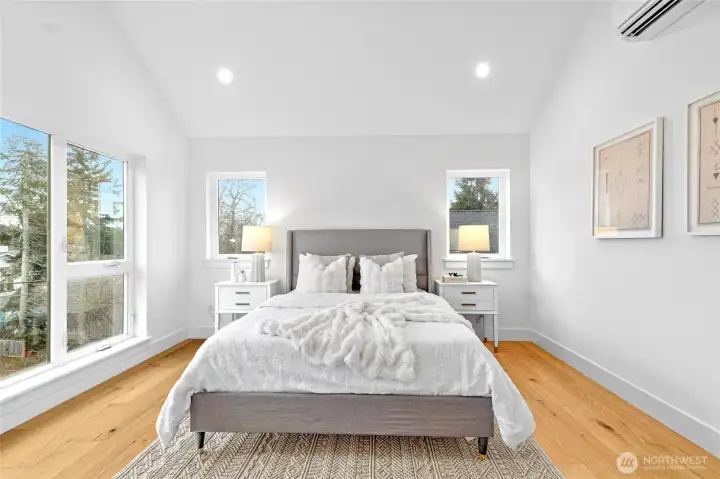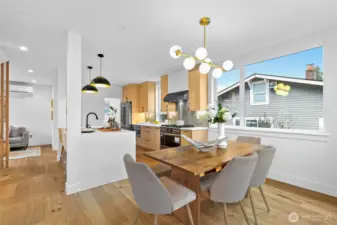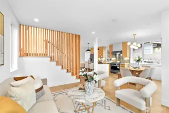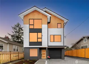 New 3-bed/3.5-bath Ballard home with exceptional street presence. Soaring ceilings and large windows bathe every room in natural light. Main level excels for entertaining with seamless flow between TWO distinct living rooms (or convert one to office), dining room, chef's kitchen with white oak cabinetry, gas range, custom hood, premium appliances plus dedicated prep kitchen. Top floor primary suite with spa bath and second bedroom. Rooftop deck with sweeping views. Ground level: private office, guest suite and heated garage/flex space. Mini-split A/C throughout. Heated floors in bathrooms. Engineered hardwood throughout—no carpet. Walk to NW 65th eateries. Quick access to Golden Gardens, 15th/99 for easy SLU/DT commutes. Top-ranked schools!