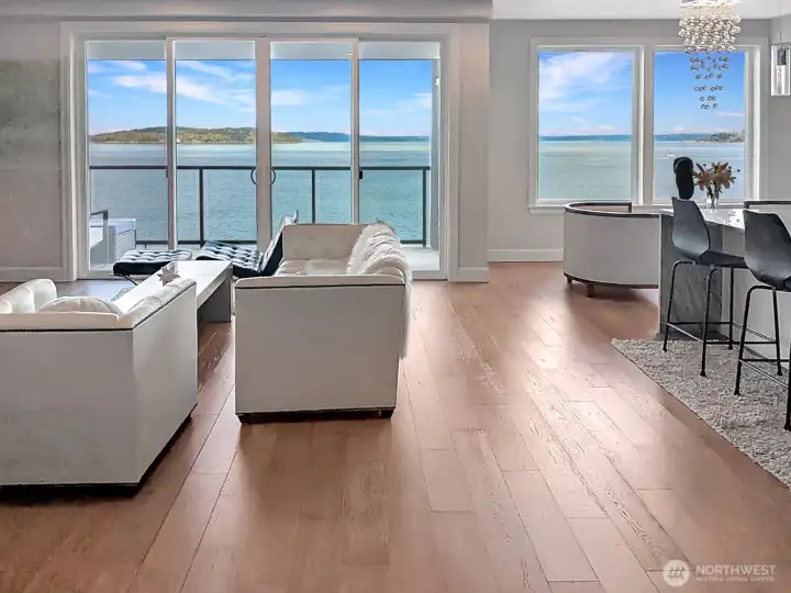 Experience Penthouse living above Point Ruston, where sweeping Sound and mountain views frame every room. A custom kitchen with elevated finishes opens to a separate dining area overlooking the water. The airy living room is spacious enough for a grand piano and offers a cozy movie-night setting by the gas fireplace. The luxurious primary suite features a spa bath with heated tile floors, soaking tub, and large walk-in closet. A secondary suite provides an ideal guest space or home office. Enjoy a generous utility room with abundant storage, plus additional exterior storage on the same level. Two reserved parking spaces included. Enjoy having shopping, restaurants, entertainment, & more all easily accessible from a place you can call home.