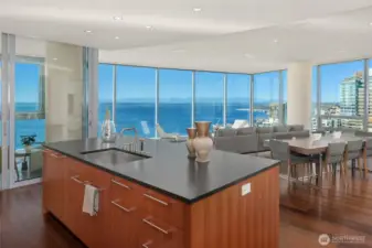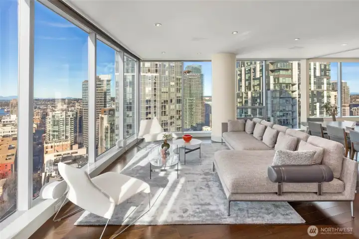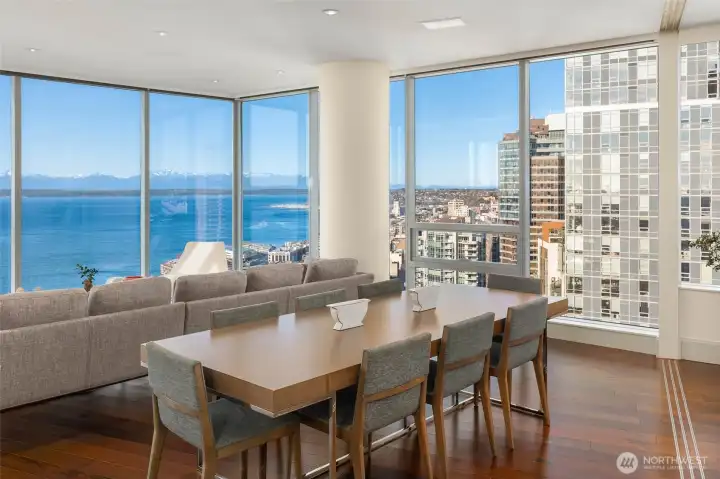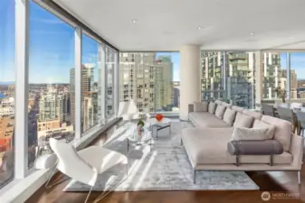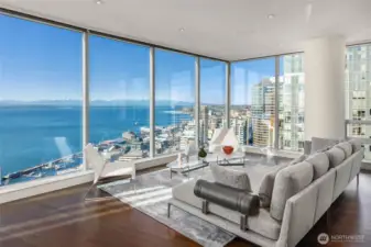 Sophisticated and refined design in this coveted NW corner home located at the award winning condominium Fifteen Twenty-One Second Avenue. Elegant art galleries for the passionate collector, gracious dining and living room for entertaining or taking in the views of Elliott Bay, Pike Place Market, Olympics and city skyline. Water and mountain views from both bedrooms located in opposite wings. Luxurious primary suite, spa bathroom, epicurean kitchen, media room, pantry, 3 parking spaces with EV, coveted large work studio, wine cellar and large storage. Concierge 24/7, new waterfront park, new aquarium, arts, restaurants, stadiums, retail and light rail. Rooftop terraces, BBq, gym, yoga, boardroom, skylounge.