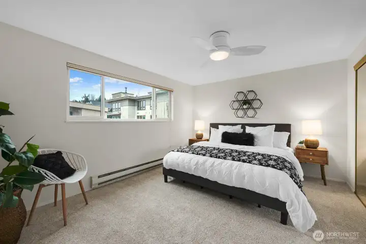 This spacious home has a large living room & dining area plus great city views from every room. The open-area floor plan allows for a desk & chair also w/a great view. The view shown is from the unit itself w/a sliding glass door to the deck & a wall of western windows for exceptional city, Space Needle & Seattle Center vistas. The galley kitchen has all new appliance (all appliances included). There is room here to please the chef with cupboards over & cabinets under. There are two open shelves in the kitchen to display your nicest dishes or for cooking items you may want at hand. The bedroom has room for a king or queen bed w/room for two nightstands. There is room for a reading corner. Amazing access to downtown, garage parking too.