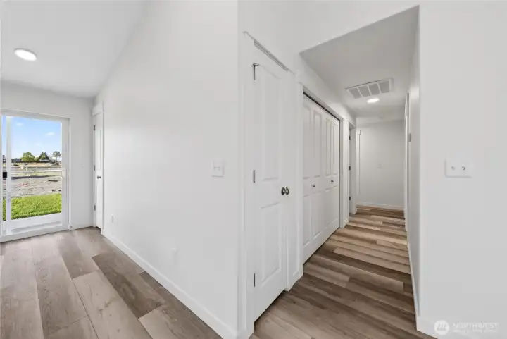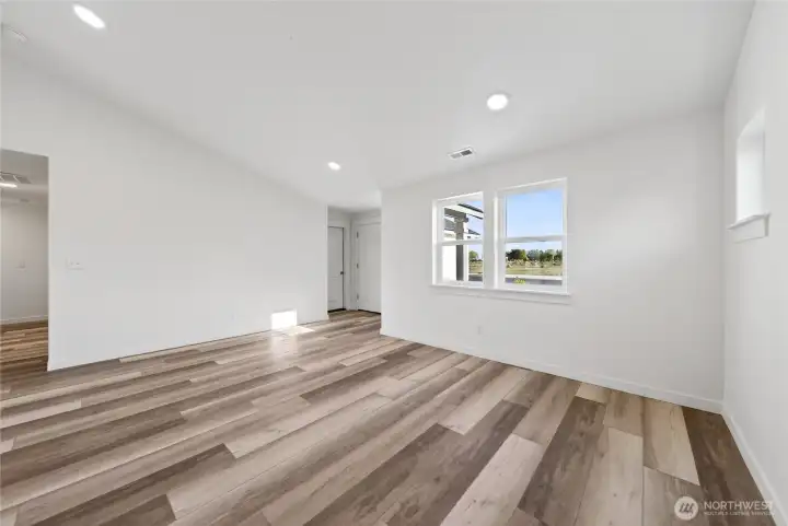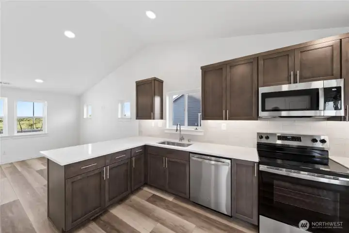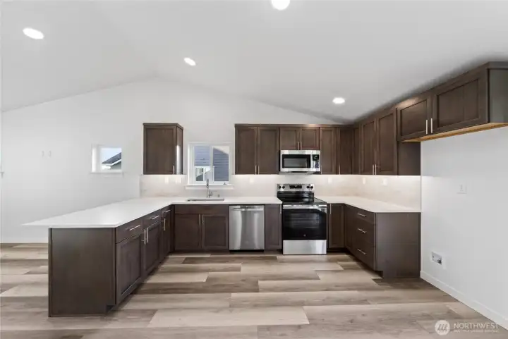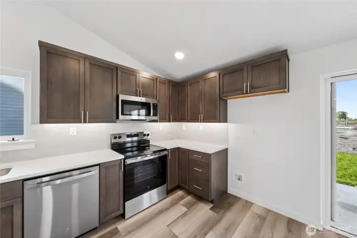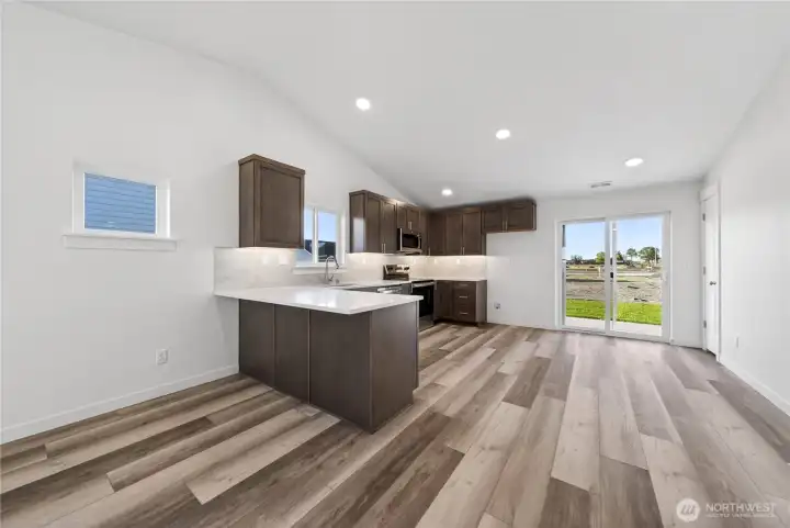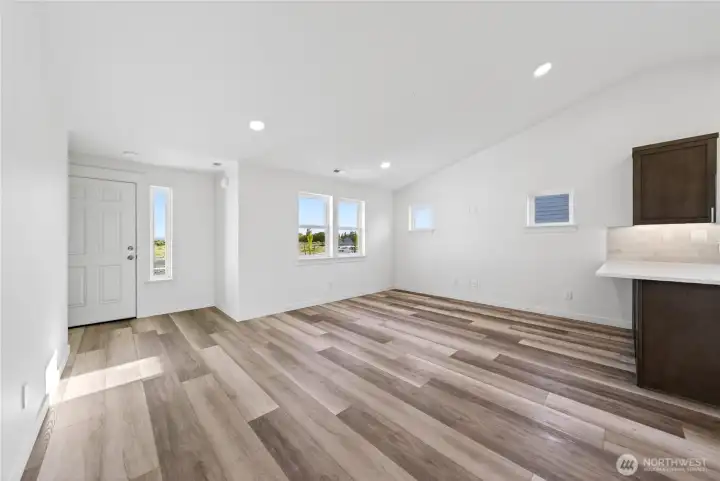The 1148 square foot Alderwood has long been a favorite for those seeking both comfort and function in a modestly-sized single-level home. High vaulted ceilings add volume to the already expansive living room, overlooked by the open kitchen, and adjoining dining area. The generous main suite boasts its own private bathroom and substantial oversized closet. The additional two bedrooms are equally sizeable and share a second bathroom. A large laundry closet offers valuable storage space to this incredibly efficient home.