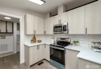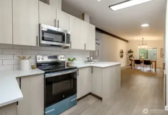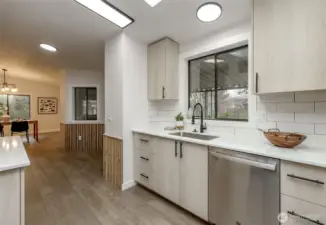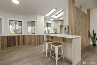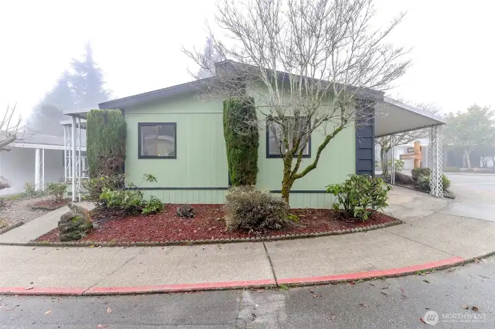 Price Reduction! Welcome home to this updated modern residence in the highly desired Kloshe Illahee, 55+ Community. This well-designed home features European-style flat-front custom cabinetry with soft-close drawers, stone countertops, and a large kitchen peninsula with extra seating, ideal for daily living and entertaining. The home offers three bedrooms and updated bathrooms, including a tiled walk-in shower in the primary suite. Two separate living spaces provide flexibility for shared living if desired. Situated on a generous corner lot with rose bushes along the front porch, plus covered parking, a porch sitting area, and an additional storage shed. A rare opportunity to own a stylish, functional home in a peaceful and sought-after community. Hurry, don't wait!
