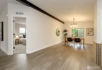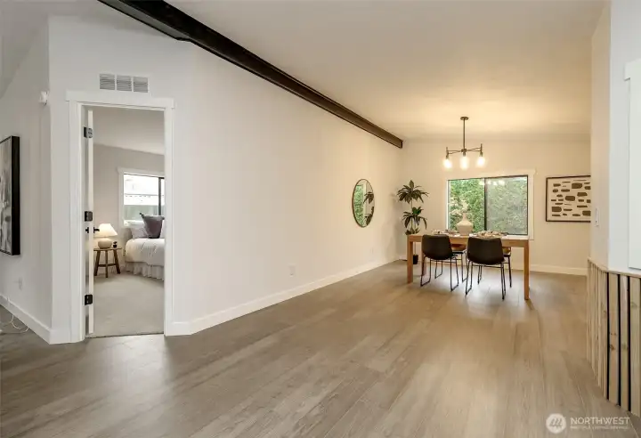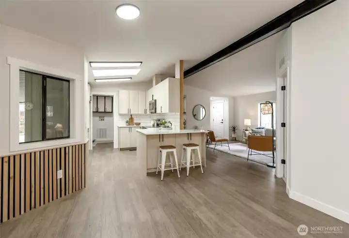 Welcome home to this updated modern residence in the highly desired Kloshe Illahee Community. This well-designed home features European-style flat-front custom cabinetry with soft-close drawers, stone countertops, and a large kitchen peninsula with extra seating, ideal for daily living and entertaining. The home offers three bedrooms and updated bathrooms, including a tiled walk-in shower in the primary suite. Two separate living spaces provide flexibility for shared or multi-generational living. Situated on a generous corner lot with rose bushes along the front porch, plus covered parking, a porch sitting area, and an additional storage shed. A rare opportunity to own a stylish, functional home in a peaceful and sought-after community.