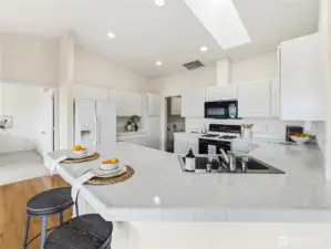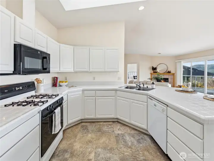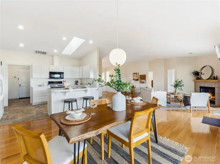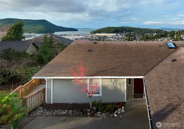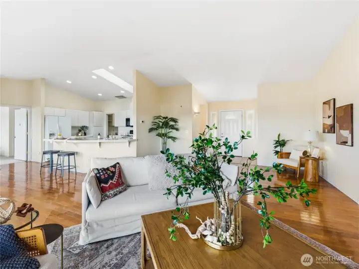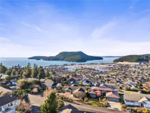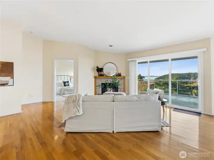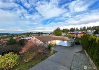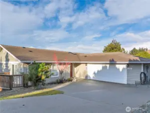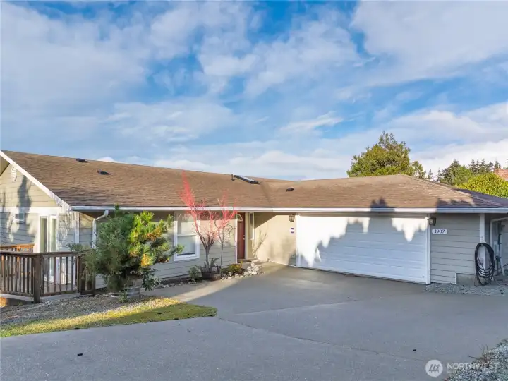 One level living with a stunning view! Fabulous vistas & gorgeous sunsets over Burrous Bay & the Olympic Mountains-light & bright w/walls of windows, hardwood floors & cathedral ceiling. Cozy gas fireplace in great room. Expansive deck for soaking in the view. The kitchen offers tons of storage, walk-in pantry & eating bar. The primary suite has stunning views, deck access, walk-in closet & jetted tub. Two additional bedrooms, one with private deck, the other with beautiful view. New carpet & paint make this home move-in ready. 17K+ SF lot, lg garage, RV & extra parking, mature gardens & huge, dry storage under house. Skyline Beach Club lifestyle includes private beaches, marina, boat launch, cabana, pickleball & tennis—just minutes away.
