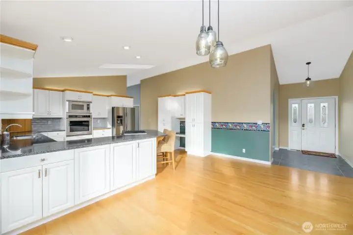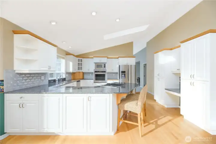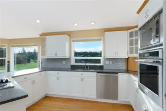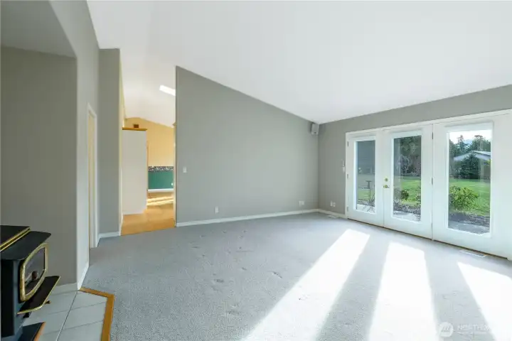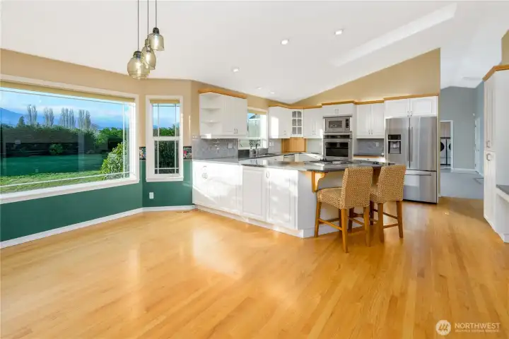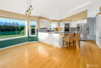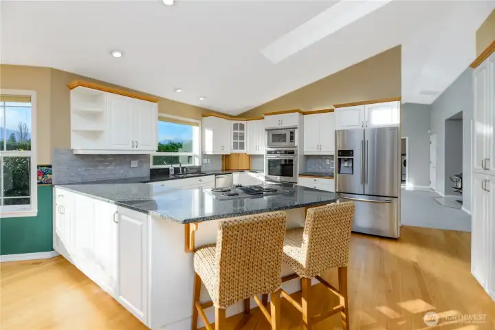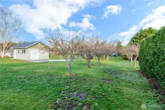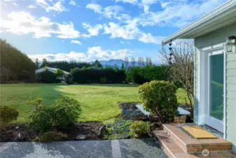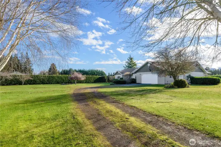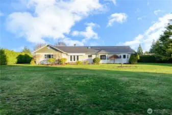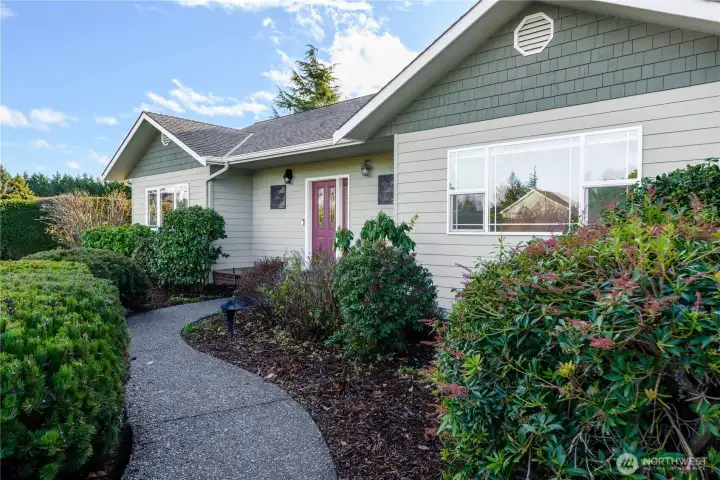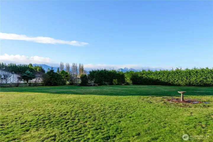 Beautiful rambler with vaulted ceilings and breathtaking mountain views from nearly every room. The spacious open-concept kitchen flows seamlessly into the living room, featuring a cozy fireplace and direct access to the back patio—perfect for indoor-outdoor living. The primary suite offers a private ensuite, while all bedrooms include walk-in closets. Abundant additional storage throughout the home adds to its functionality. Situated on a fully landscaped 1.25-acre lot with a 432 sq ft workshop, apple orchard and the backyard is surrounded by mature hedges for exceptional privacy. A rare blend of space, comfort, and scenery.