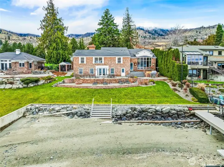 Experience premier lakefront living on Lake Chelan with 100+ feet of sandy beach, two private docks, and covered boat lifts along the prestigious Golden Mile. This remarkable 7-bedroom, 5-bath residence features a thoughtfully designed layout with a spacious open-concept kitchen and great room, private living room, and daylight recreation room—ideal for entertaining and everyday comfort. Expansive outdoor living spaces include concrete patios, manicured lawns, and a gentle slope to the beach and docks, all surrounded by privacy and natural beauty. Just 3 miles from downtown Chelan and within walking distance to renowned wineries, this prime waterfront property can be combined with neighboring parcels and home to create a magnificent estate.