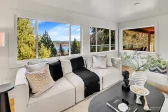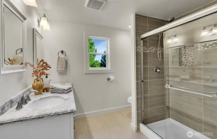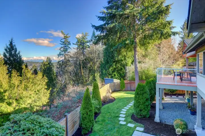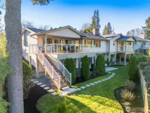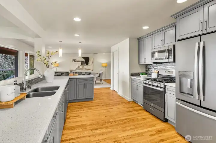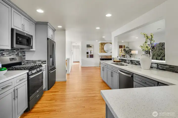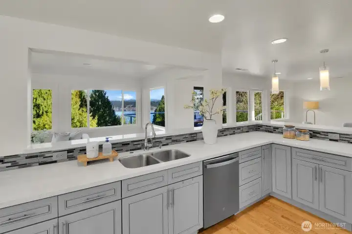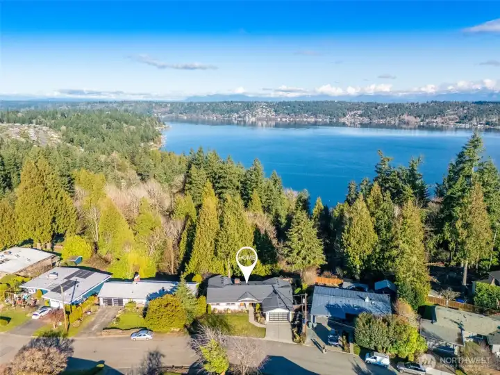 Stunning Lake Sammamish and Cascade Mountain views to be enjoyed year-round from your deck and really...most all living areas of this home! This 2017 rebuilt home is turn-key! Offering view oriented casual open-concept living spaces and dining spaces on the main level, gleaming hardwoods, a gourmet kitchen and cozy fireplace. An oversized big view entertaining deck off main, with gas hook up invites 365 days a year. A coveted main-floor primary suite, generously sized with view deck, walk-in closet; plus 2 additional bedrooms with built-in closets and bath complete the main level. The homes versatile layout includes a spacious lower level with 2 additional bedrooms or office. The family room is large enough for big gatherings and your pool table too! Lower level walk-out patio invites to lovely established landscape and connects to upper level deck. Fully fenced back yard offers beautiful landscaping and privacy! Beautiful garage! Located in an quiet established, sought after Lake Hills neighborhood, near parks, hiking, biking! Great shopping. Desirable Bellevue Schools! Tech Hub friendly with easy pivot to 405 and 1-90!