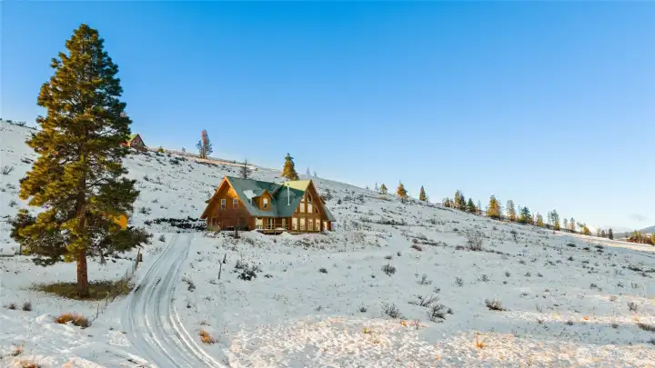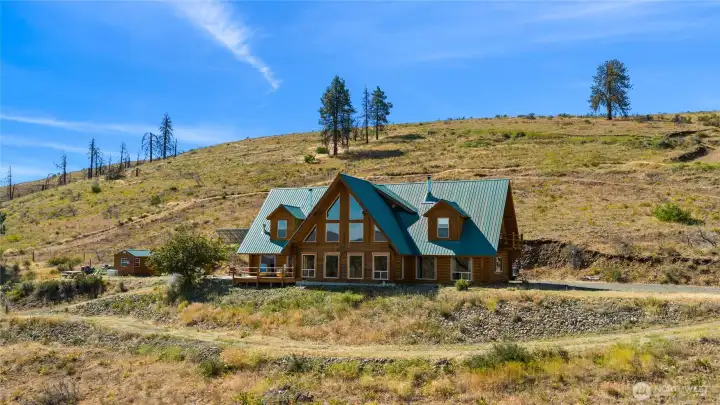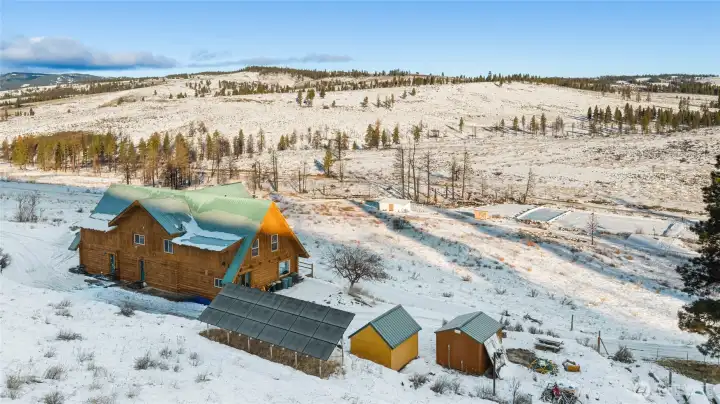 Incredible log home with sweeping views of rolling hills out of nearly every window. If you're looking for privacy and elbow room, you'll find it here, with more than 9 acres to play with. Soaring 25 ft ceilings, cozy fireplaces at every turn and a chef's dream kitchen. Two primary bedrooms and a large-sized guest room. Loft makes a perfect reading nook. Live off the grid in confidence with new solar panels and new generator and propane; well water with new pump. New metal roof. Starlink installed for HS internet. Tons of space for all your toys, RV parking, ATV's etc. Newly built horse stables and pen, plenty of space for a hobby farm, chickens and goats. Newly graded area, currently used as a horse arena in summer and ice rink in winter.