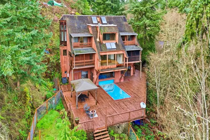 Wake up to breathtaking views of Mount Rainier and the Orting Valley from this rare hillside property with endless potential. Priced approximately $200,000 below tax assessed value, this fixer presents a unique opportunity for an owner-builder, investor, or buyer looking to create a custom dream home or private compound. Features include an indoor/outdoor pool, detached garage with 220 power and a DADU above—ideal for guests, rental income, or studio space. With an impressive 800 amps of power on site, the infrastructure supports extensive upgrades, workshops, or specialty uses. Expansive grounds and multiple decks offer exceptional indoor-outdoor living in a setting that cannot be duplicated.