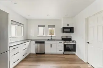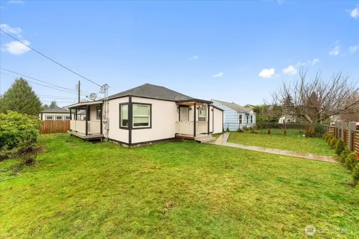 Two separate fenced houses on one parcel totaling 1,336 sf with 4 bedrooms and 1 3/4 baths, separate entrances from two streets and individual electrical meters — an investment opportunity. Currently generating $2,200/month from the main house; ADU is vacant for future rental or owner use. Main house offers 720 sf plus a 282 sf deck, fully renovated with new siding, floors, appliances, water heater, kitchen, bath, windows, wall electric heating, fireplace, upgraded sewer line and insulated crawl space. Features 2 beds, 1 bath, off-street parking and attached storage. NEW DADU built in 2024 offers 646 sf with 2 beds and 3/4 bath. Detached garage 252 sf. Heating via mini-splits, tankless WH. Includes microwave, dishwasher, stove and fridge.
