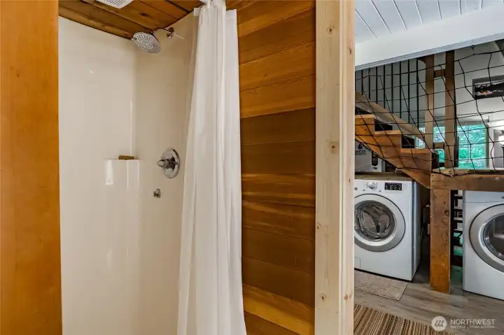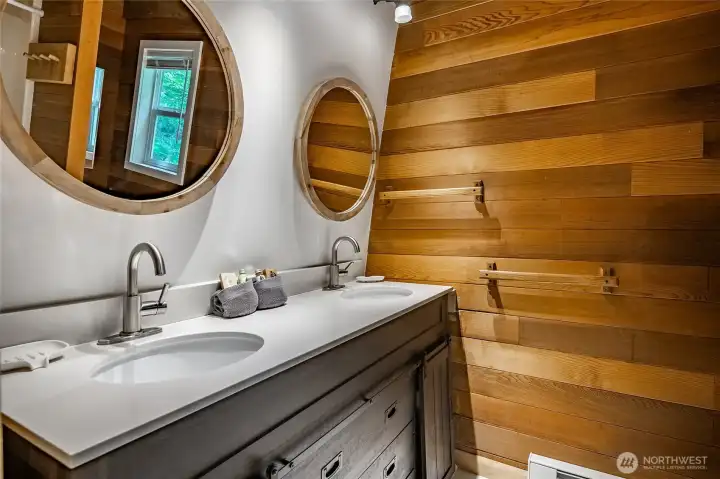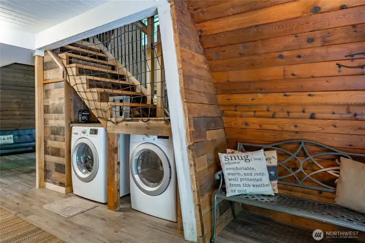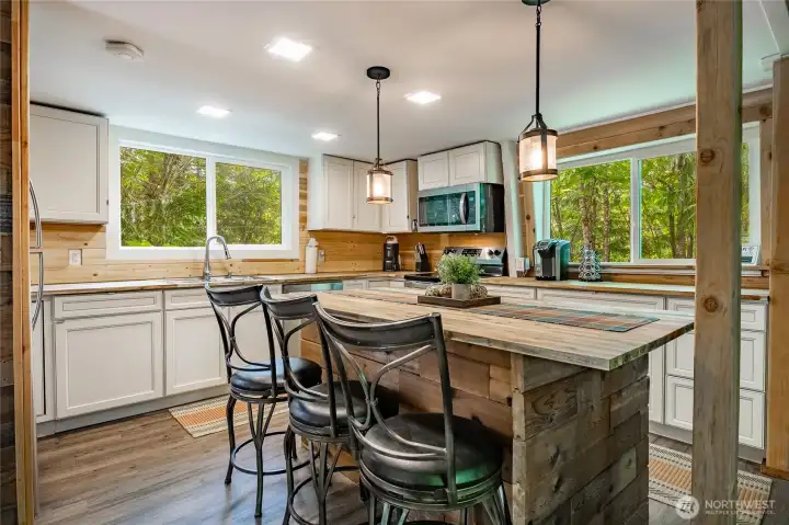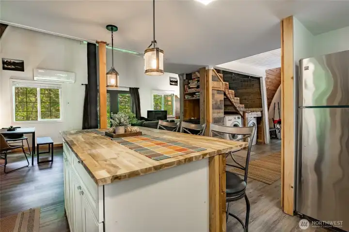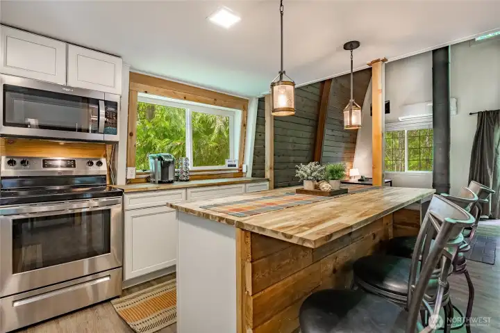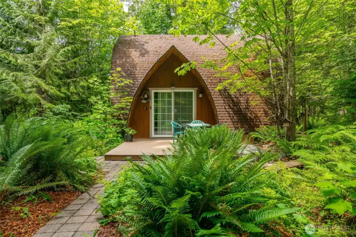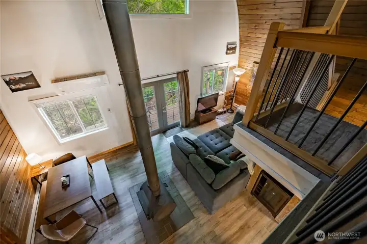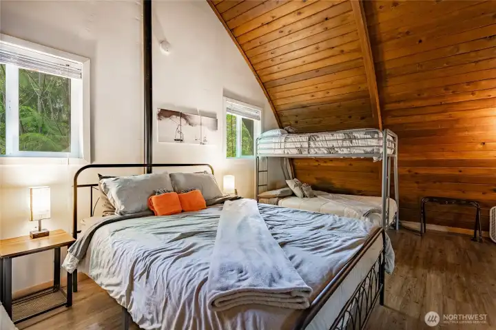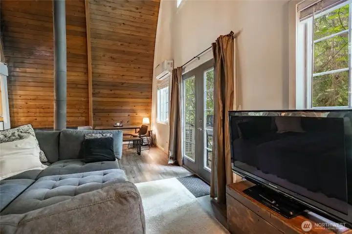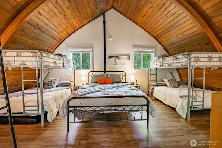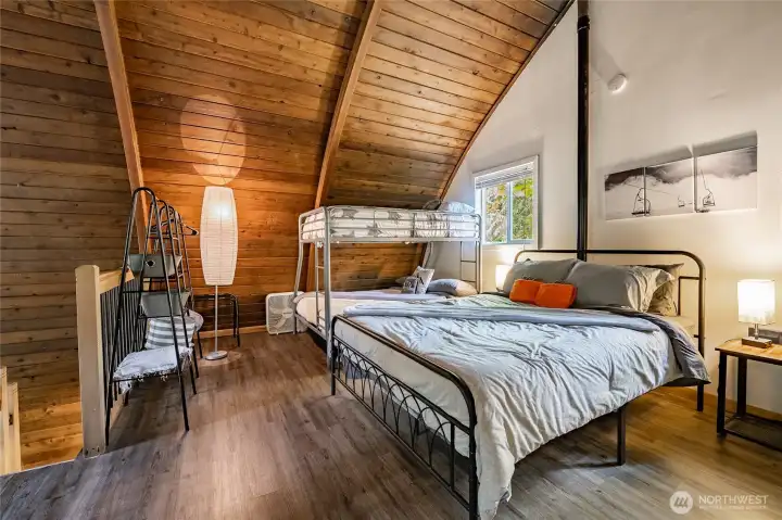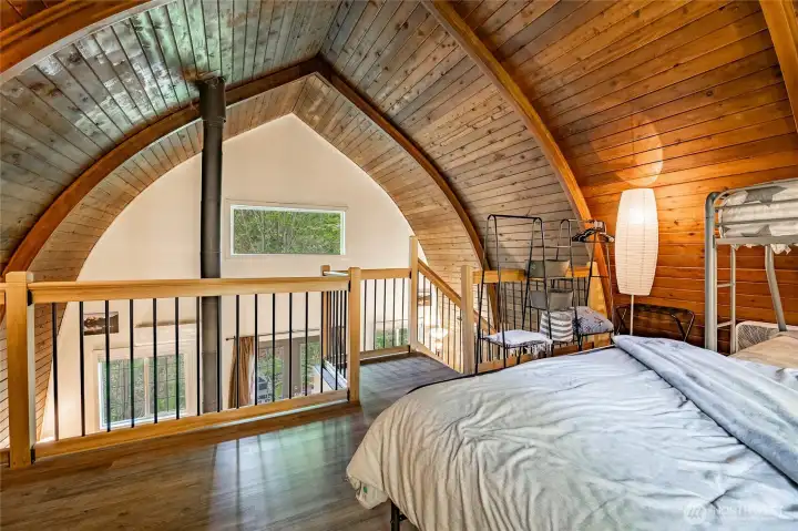 Welcome to this striking Gothic Arch residence, where refined modern comfort meets timeless rustic elegance. Showcasing rich cedar craftsmanship, dramatic two-story arched beams, and an airy loft-style design, the home offers a distinctive architectural presence with elevated, contemporary appeal. Offered fully turnkey, this established vacation rental includes all appliances, curated furnishings, and thoughtfully selected contents, presenting an effortless, move-in-ready investment or private retreat. Energy-efficient enhancements include a smart, app-controlled Nest system, sleek mini-split heating and air conditioning, and on-demand tankless hot water. Outdoor include, a pre-wired gravel pad is ready for your custom hot tub installation, while the expansive corner lot invites elevated outdoor living. Meandering paths, a fire pit, storage shed, two low-maintenance Trex decks, a picnic area, and dual BBQs create an exceptional setting for sophisticated entertaining or serene relaxation.