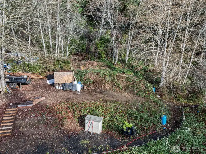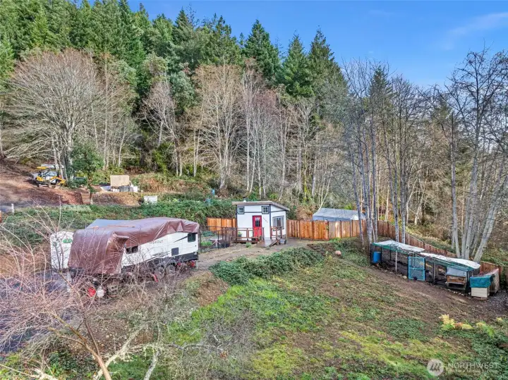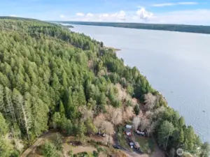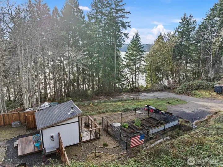 Discover a unique 1-acre hillside retreat on North Shore Rd in Belfair offering sweeping Hood Canal views and peekaboo Mt. Rainier vistas from multiple points on the property. The land features 3+ leveled pads ideal for RV camping, weekend getaways, or future build plans. Included is a charming 144 sq ft off-grid tiny home with a wood-burning stove, perfect for year-round use. Enjoy established, oversized raised garden beds within a fenced area. Water is currently supplied by an artesian source; a well will be needed. Power is available in the easement. Property backs directly to DNR land, providing added privacy and long-term value. A rare opportunity to own a view property with improvements already in place. 3 Bedroom Septic is approved.