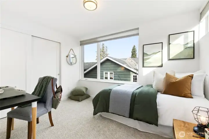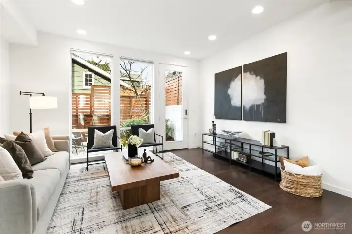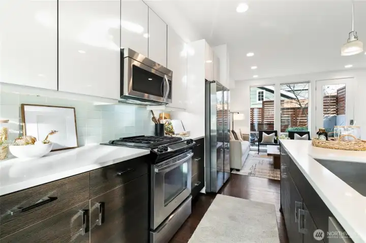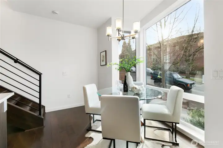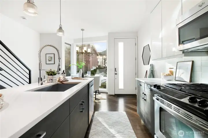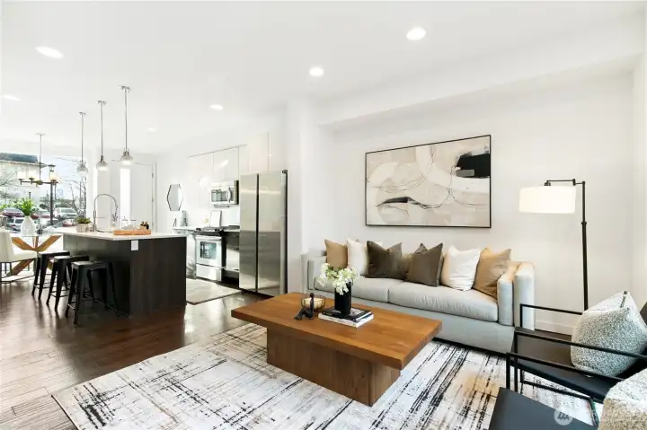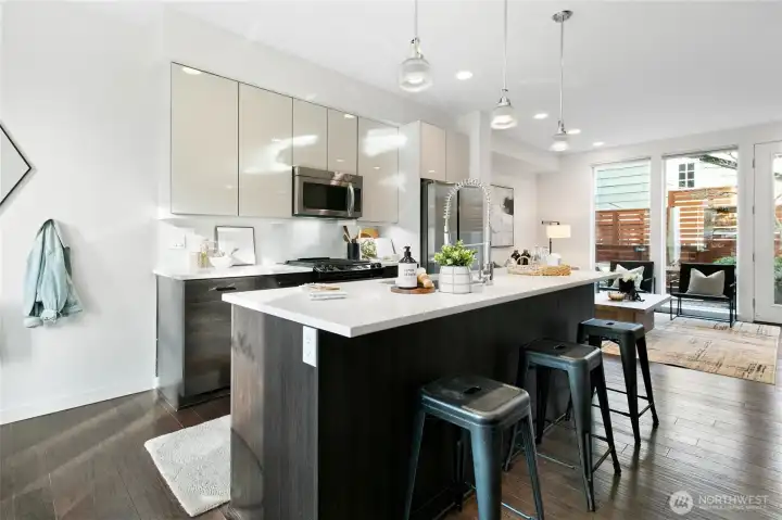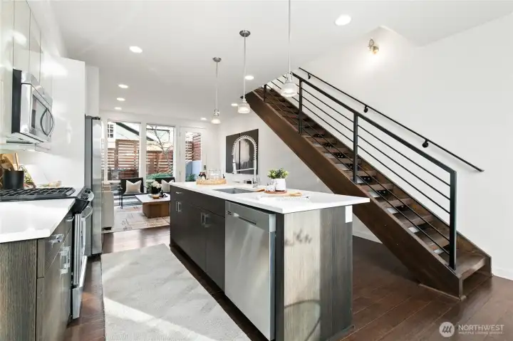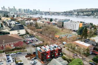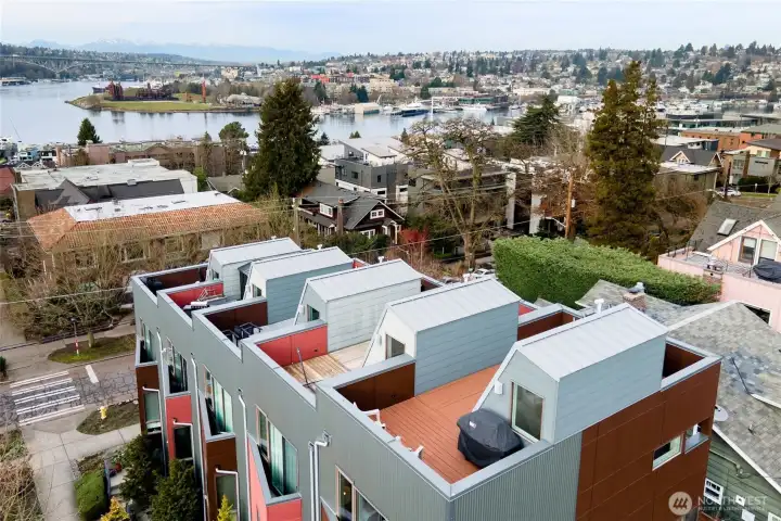 Modern Eastlake townhome with sweeping Lake Union, downtown & Space Needle views from a private rooftop deck made for sunset hangs and entertaining. Open-concept main floor features a sleek kitchen with quartz counters, gas range, & hardwoods. Floating stairs lead to 3 light-filled upper bedrooms, while radiant in-floor heat, tankless hot water, and double-wall construction deliver comfort and efficiency. Multiple patios, dedicated parking, no dues. On a quiet, tree-lined street just steps to Eastlake cafés, bars, & parks, with easy access to SLU, UW, & downtown—urban living with a true neighborhood feel. Don't miss this rare opportunity to own a Denizen home in Eastlake. Mortgage savings may be available for buyers of this listing.