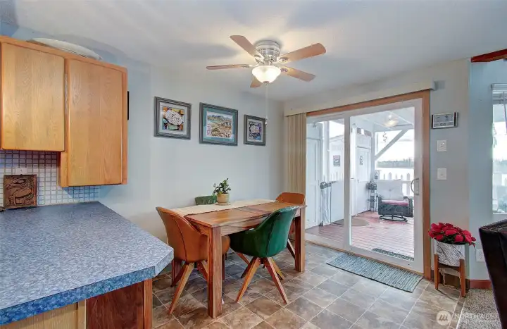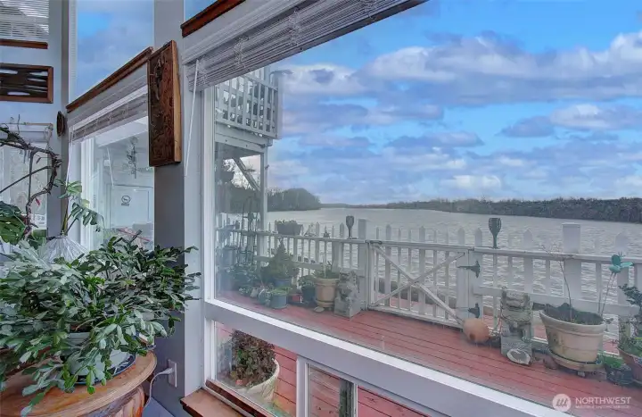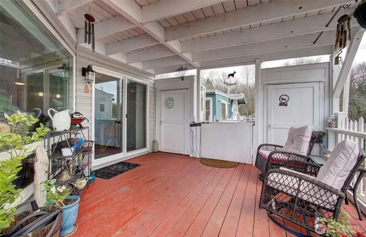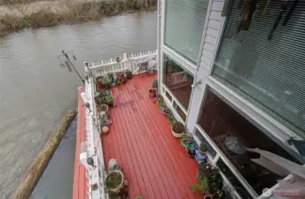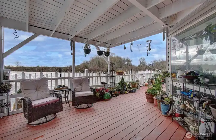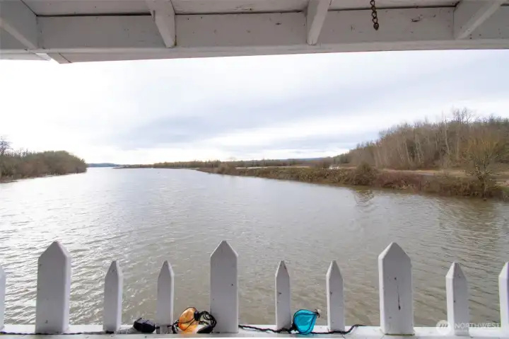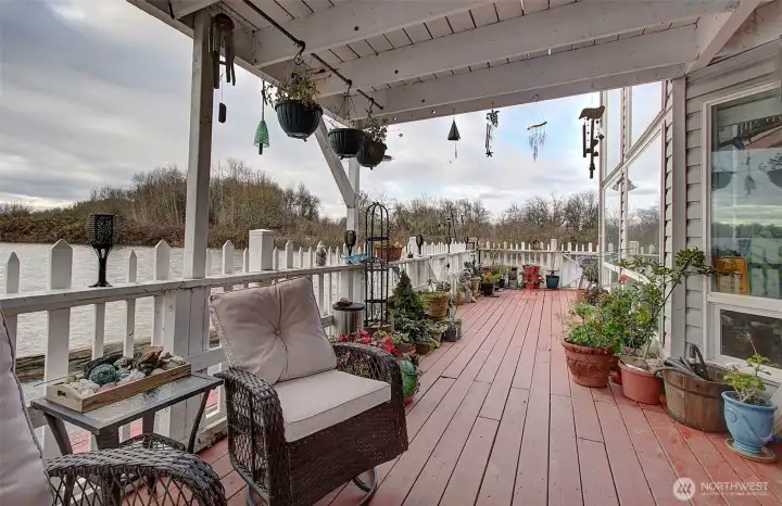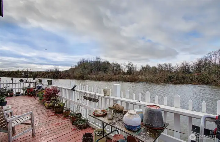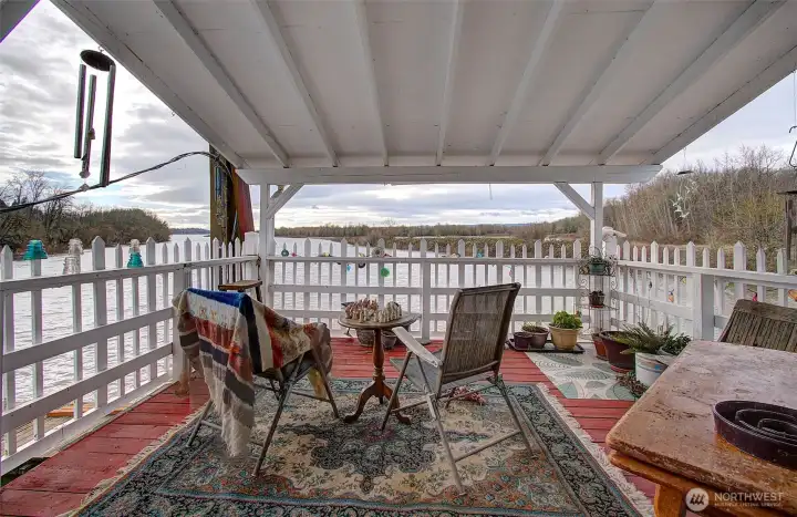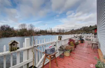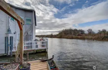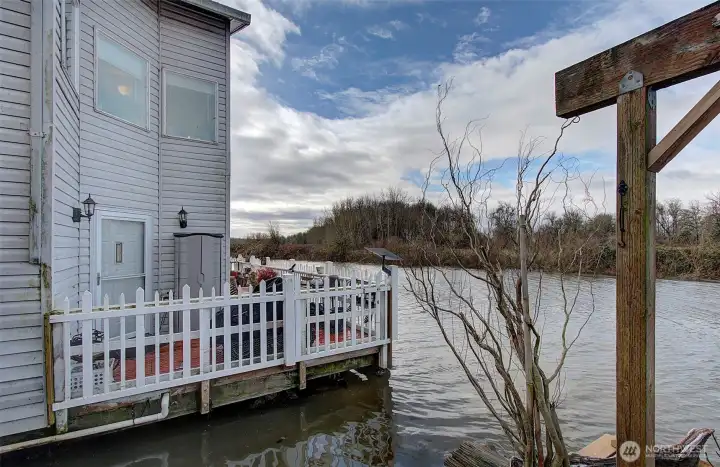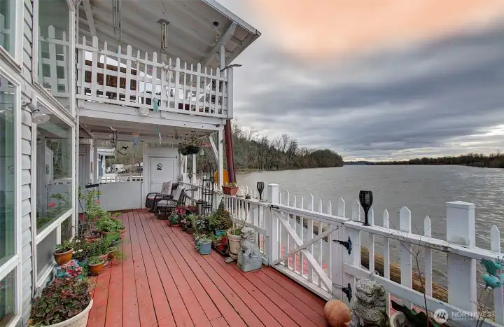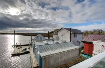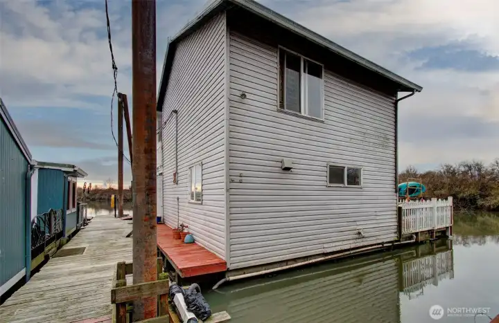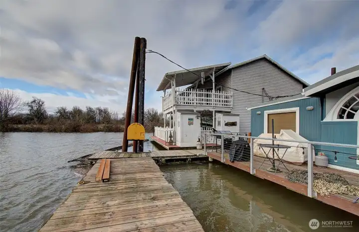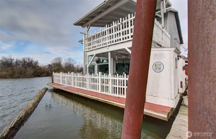 Unobstructed views abound! Come home to this beautiful 2-story floating home ideally located in Felida Moorage. This end-dock position offers panoramic, unobstructed views. Home features 2 bedrooms | 2 bathrooms, a metal roof, durable vinyl siding, and updated log and stringer flotation. The main living area offers large windows that fill the space with natural light, and the cozy kitchen includes all appliances. The primary bedroom suite, with full window views of the water, features access to a covered upper deckâperfect for morning coffee or summer sunsets. Additional lower-level deck space is ideal for outdoor living. Wraparound decking includes access gates directly to the water. Two large locking storage units provide easy access.