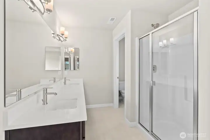 Under construction, The Rainier, has it all from the formal dining room, butler pantry, gorgeous kitchen with maple shaker cabinets stained in Cocoa, stainless steel appliances incl refrigerator, quartz counters throughout, hardwood floors in entry way, dining room, kitchen and nook area plus window blinds throughout home. Primary suite with soaking tub with tile surround, & double sinks with tile backsplash, plus a walk-in closet. Energy efficient features include a heat pump for your heating and cooling needs, solar panels, & heat pump water heater. Landscaped front and back with fenced back yard. Photos, incl. virtually staged, are from similar plan on different lot for illustration only, features may vary. Home will be complete on 1/26.