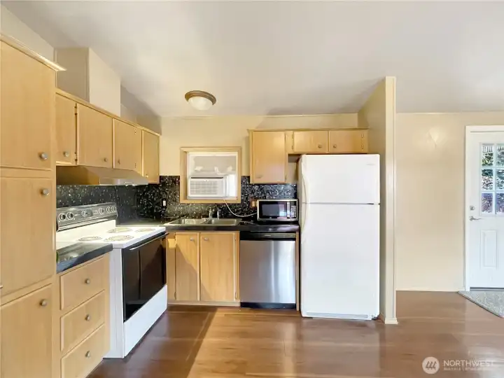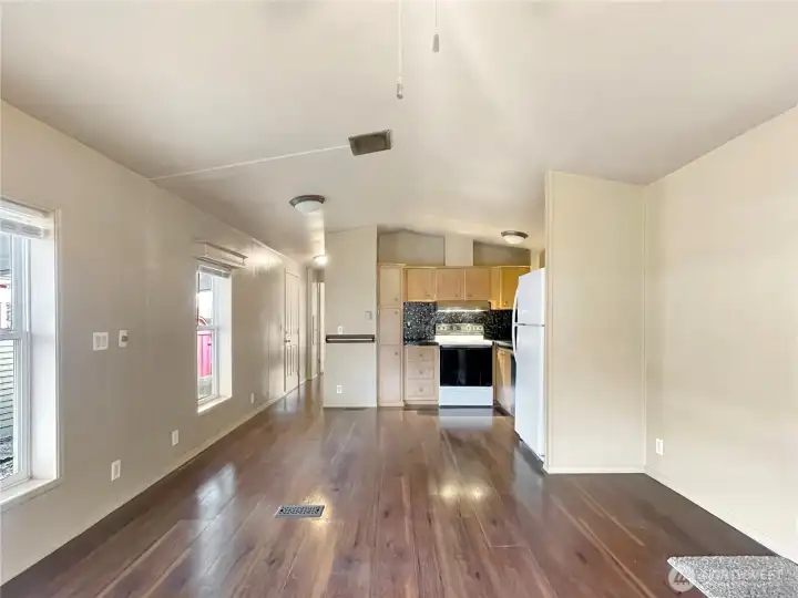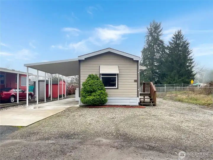 Charming and well-maintained home located at the quiet dead end of the street in a desirable 55+ community. This home feels surprisingly private and has been thoughtfully updated with a new roof, HardiePlank siding, new water heater, new dishwasher, new flooring, new awnings and new carport. Freshly painted inside and out. The interior features vaulted ceilings and a comfortable one-bedroom, one-bath, open-concept layout. All appliances convey- including a washer & dryer. From the kitchen window, enjoy peaceful views of trees and county-owned green space. Well insulated for year-round comfort and includes a well-built 10' x 12' storage shed with lofts for additional storage space. Enjoy peaceful living in a quiet, very well-maintained park.