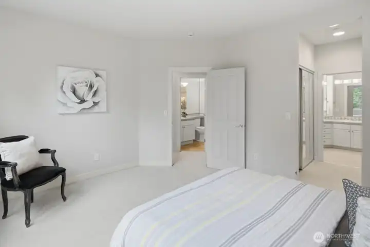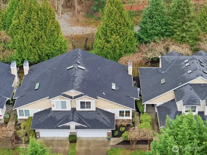 Perfectly Private & Bright with peaceful views & sounds of Issaquah Creek! This spacious & lovingly maintained 1,859 SF, 3 Bedrm/2.25 Bath TH features vaulted ceilings, an open floor plan & skylights that bring warmth to every corner. Privacy & views from an en-suite primary on the main with dual closets & from a bright living room that opens to a peaceful patio & lawn where you can relax while watching the salmon run. Upstairs, there's a spacious loft area & 2 more bedrooms with walk-in closets. Newer roof, A/C & furnace for yr-round comfort & the convenience of a roomy 2-car garage. Coho Run is GATED living at its best in the heart of downtown Issaquah. Enjoy the peace of a well-kept community w/easy urban access and a tranquil backdrop!