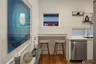 Green Lake townhome makes a lasting impression with thoughtful design + stunning rooftop deck. The interior space, with its high ceilings, features generous light + a neutral color palette reflective of a thoroughly modern urban aesthetic. Stainless-steel appliances in the kitchen include a 5-burner gas range. Quartz counters, white cabinetry + a textured tile backsplash add refinement. Two comfortable guest bedrooms + a full bath are found on the home’s second level. Retreat in luxury to the primary bedroom suite which occupies the entire third level. Entertainers will appreciate the views + gas BBQ hookup on the deck. Directly across from park + near vibrant restaurants + public transit.
