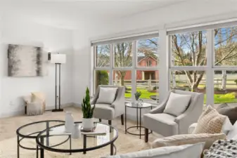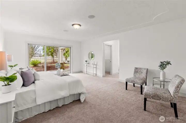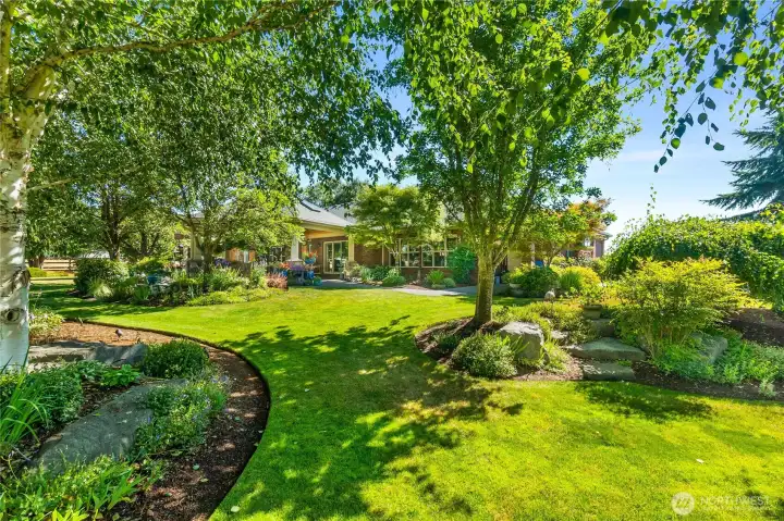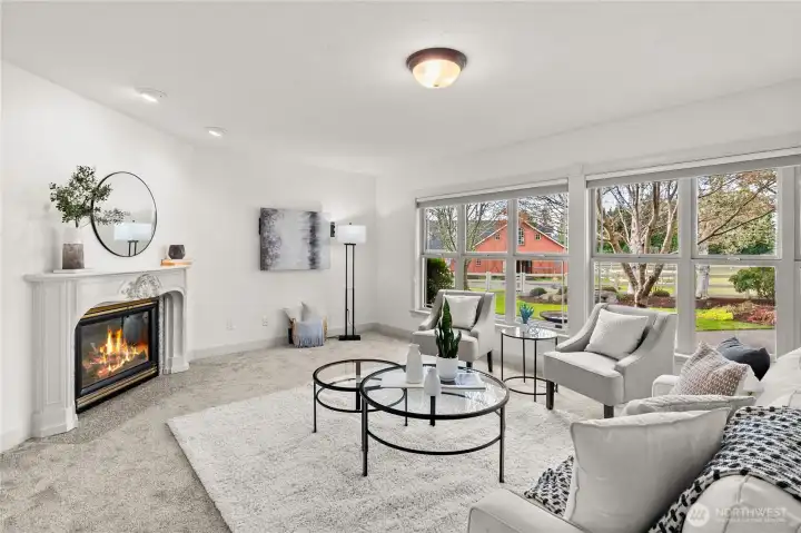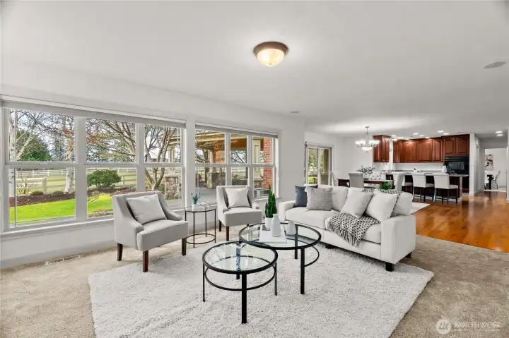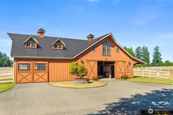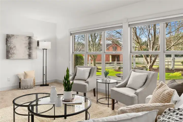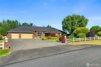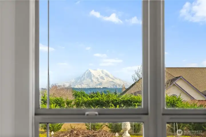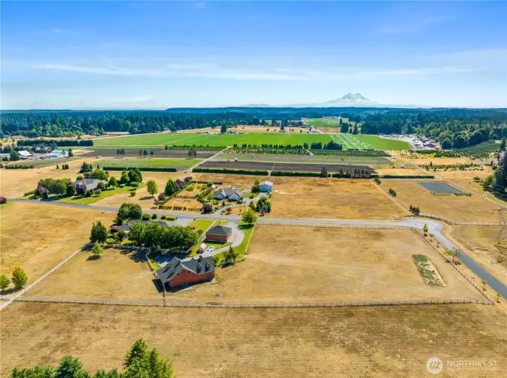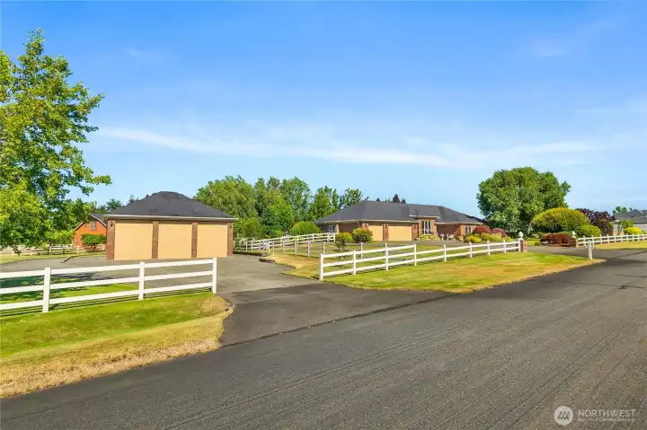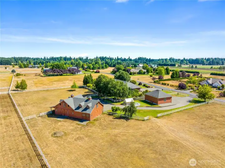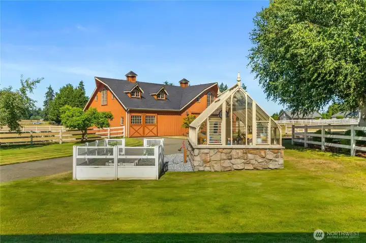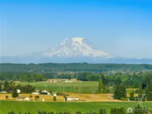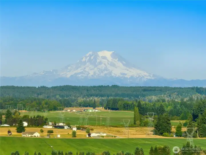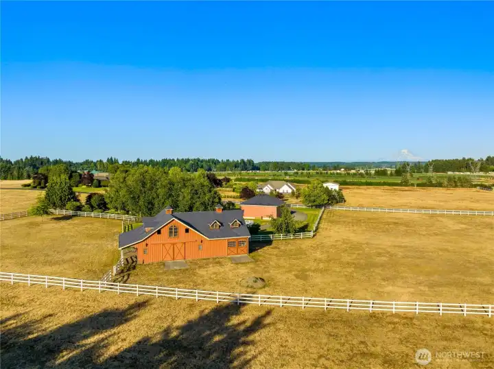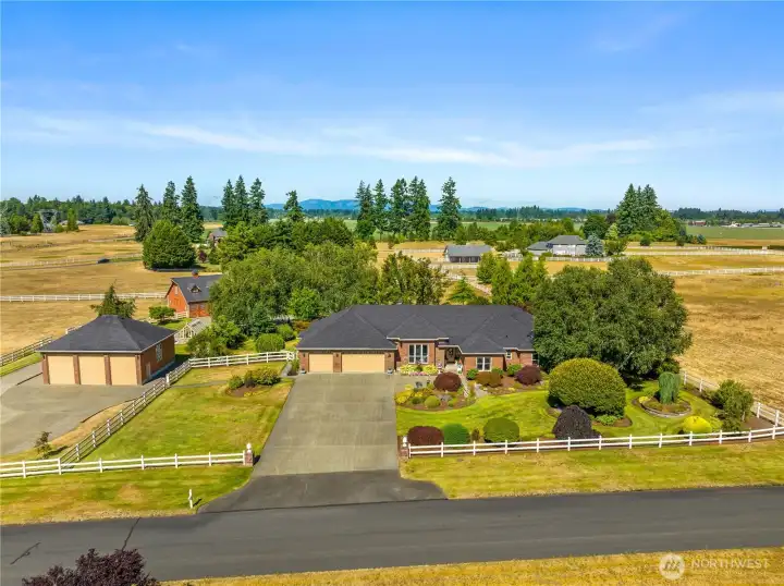 Impeccably maintained brick rambler in an equestrian community on beautifully landscaped acreage with sweeping Mt. Rainier views. Large picture windows frame manicured gardens & fill the home with natural light. A spacious kitchen opens to a gathering room with gas fireplace while an inviting covered patio with skylights offers year-round entertaining. Park an RV or use the detached garage/shop for hobbies or storage. Realize your equestrian dreams in the stunning 4-stall barn with dormer windows, cupolas, loft & drive-through access while you watch your horses graze peacefully in PVC fenced fields. A charming greenhouse, mature trees & stonework add privacy & appeal. NEW roof/interior paint/carpet. Every detail shows quality & care.
