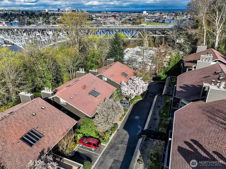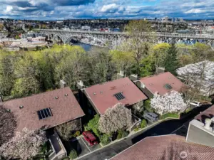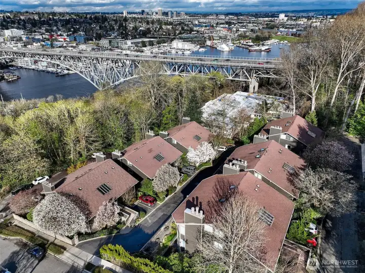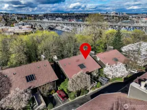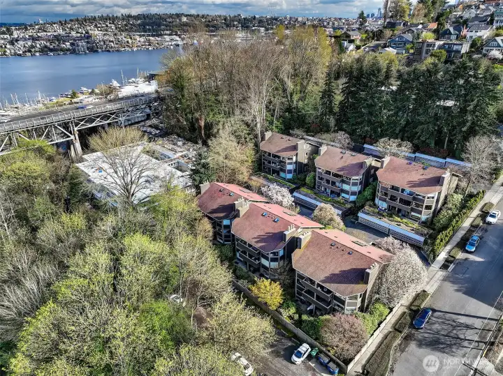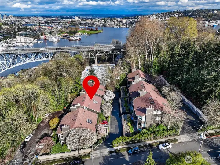 Enjoy ultimate privacy looking out big windows to trees, Fremont, and Lake Union. Top floor 2 level condo is not your basic condo with vaulted ceilings and huge windows. Brand new kitchen (in 2025!) with hardwoods, formal dining space, a private deck, and large living room featuring a fireplace and walls of windows. 3 bedrooms; two on the main floor with a full bath and a high ceiling loft style primary bedroom with ensuite bath and huge walk-in closet upstairs. New carpet and fresh paint throughout. Plenty of storage, including a large room laundry room and extra closet space. Garage parking included plus additional guest parking available. HOA includes utilities, high speed internet, Insurance, Grounds and Exterior maintenance.