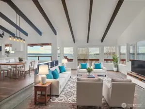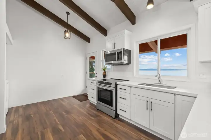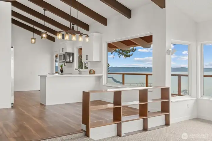 You will love this beautifully updated daylight home tucked away in a private setting with sweeping Puget Sound and Olympic Mountain views. Step inside to gorgeous new flooring, soaring vaulted ceilings, and expansive windows that showcase stunning scenery from nearly every room. Natural light fills the home, creating an open, airy feel on both levels. Designed for flexibility, the home features a true multi-generational layout with a full kitchen upstairs and a second kitchen on the lower level—ideal for extended living, guests, or potential rental. Updates include new flooring, interior and exterior paint, new windows and sliding doors, white soft-close shaker cabinetry, quartz countertops, and stainless steel appliances. A brand-new entertainment-sized deck offers views of the Des Moines Marina and perfect for relaxing or hosting guests. The detached two-car garage also provides future expansion potential. This rare, move-in-ready opportunity in Normandy Park is exactly what you’ve been waiting for.