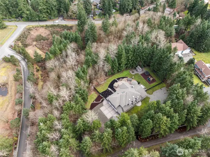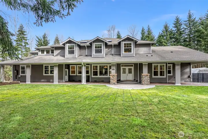 Everything you could ever want is included in this modern 5,540 sq ft Craftsman, set on 5+ private acres in a prestigious gated community. An idyllic covered porch spans the entire front of the home, warmly welcoming you inside. Two story windows flood the open-concept living spaces w/ abundant natural light, while stunning hardwood floors lead to a dramatic floor-to-ceiling river rock fireplace; an unmistakable nod to classic PNW style. Loved ones will naturally gravitate to the oversized island with generous seating, perfectly positioned to take in the activity of the gourmet kitchen. This chef’s space is equipped w/ double ovens, a six-burner gas range, two sinks, a coffee bar, & thoughtful finishes throughout. Four sets of French doors open to an expansive back patio and yard, offering flat, open spaces ideal for entertaining, play, or relaxation, along w/ wooded trails that invite exploration. The primary suite on the main level is a true retreat, featuring a gas fireplace, a lovely office wrapped in windows, an enormous walk-in closet, & a luxurious 5-piece en-suite bath. The spacious utility room, located just off the three-car garage, provides exceptional functionality w/ custom built-ins & copious storage, & leads upstairs to a rec/media room & 2nd kitchen. In addition to a second office & another bonus room, the upper level boasts 3 oversized bedrooms & 2 baths. With RV parking, a greenhouse, and so much more, this exceptional property is best experienced in person.