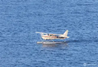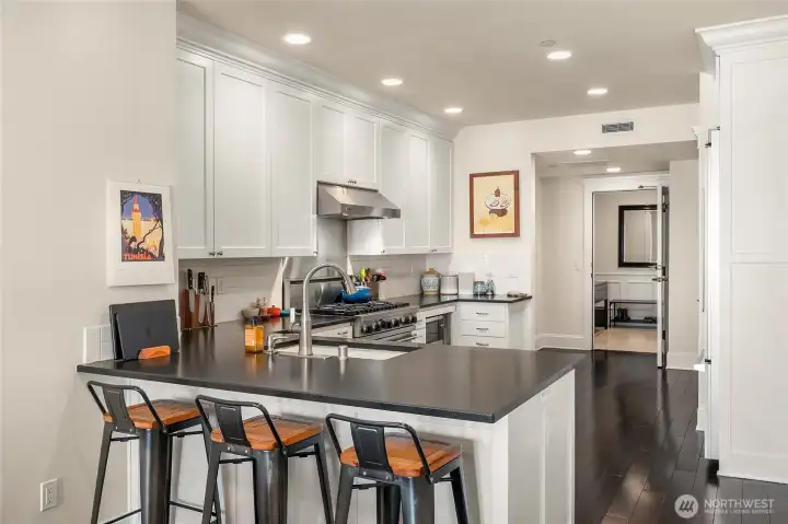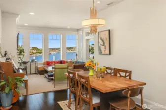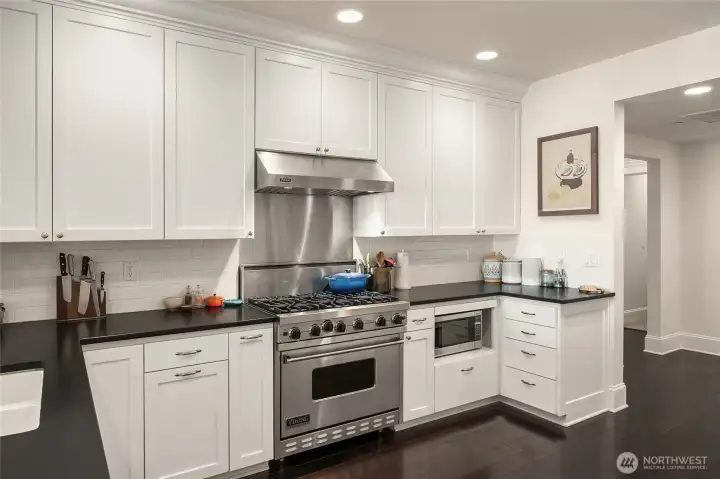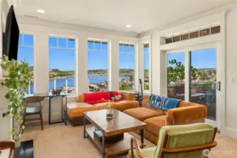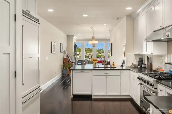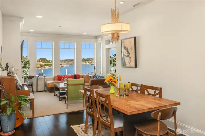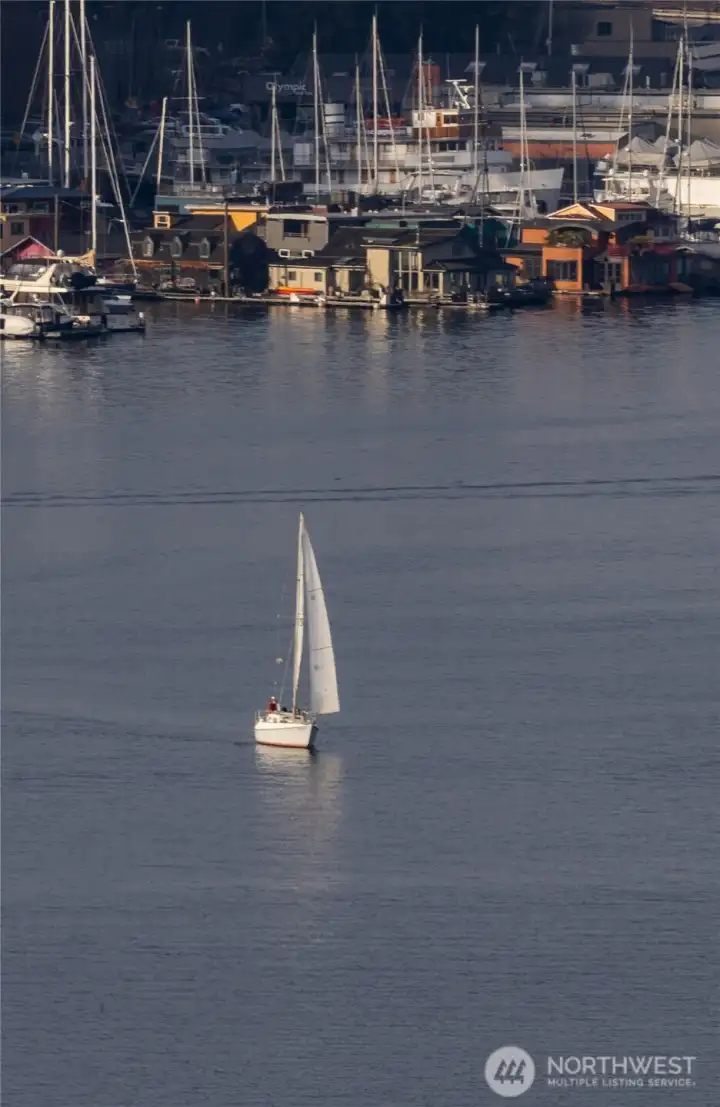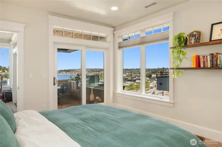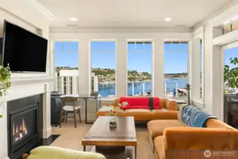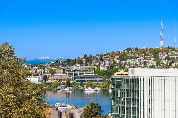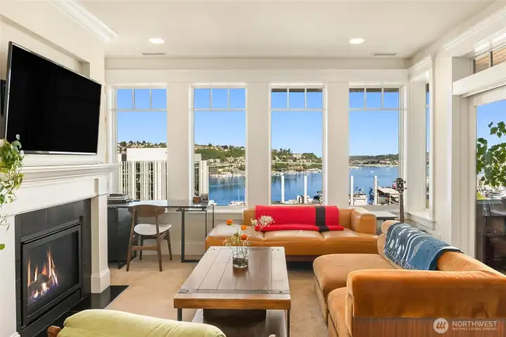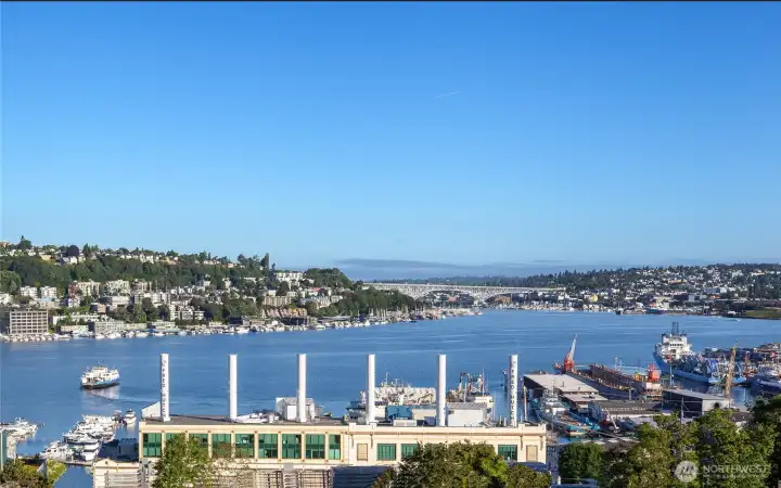 VIEW! LOCATION! SPACE! PARKING! Quiet inside! Spectacular Lake Union views, fabulous sunsets from this west-facing luxury condo. Boutique building, w/only 6 units, each has a private elevator entrance. Open gourmet kitchen w/granite counters & Viking gas range! Hardwood floors dress up the space & walls of windows overlooking Lake Union & Gasworks Park. Living room w/fireplace, 2nd bedroom w/its own bath for guests or office! Owner's suite with a marble-clad bathroom and multiple closets/built-ins. Covered private patio to BBQ & enjoy lake views. Tandem garage parking for 2, powder room, in-unit laundry, shared roof-top deck. Secure lobby entrance, secure garage parking. Very well insulated from the road, QUIET inside.