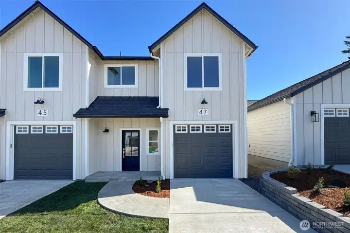 Experience high-quality living at an affordable price, perfectly situated between Sequim and Port Angeles. This brand-new end unit features a versatile layout with three bedrooms & extra windows, all finished with a beautiful modern aesthetic. Extra-deep garages provide ample storage, while private fenced backyards and expansive windows create a bright, airy retreat. In addition to the driveway, guest parking is effortless with plenty of street space. Enjoy being walking distance to the best of Carlsborg, including the Olympic Discovery Trail, transit, and local favorites for shopping and dining.