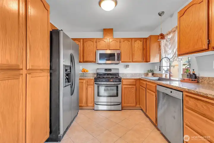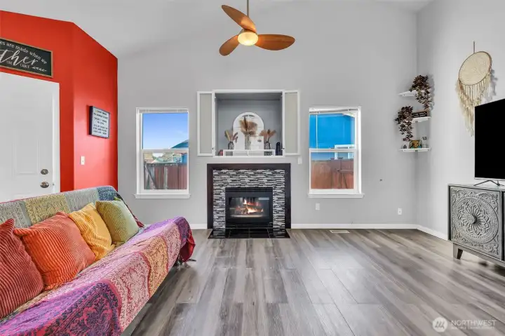 This home feels welcoming the moment you step inside. Vaulted ceilings and natural light create a bright, comfortable space that instantly feels like home. A formal living area with hardwood floors off the entry. The kitchen features stainless steel appliances, a gas range, granite countertops, tile backsplash, & an oversized sink, opening to a cozy living area around a gas fireplace with exotic wenge wood & tile. The primary suite offers crown molding, a walk-in closet with built-ins, and a well-designed bath with tile floors. Step outside to a large private backyard, and enjoy the comfort of A/C year round. The tiled garage with built-ins is a craftsman dream, offering excellent storage, & organization that is hard to find.
