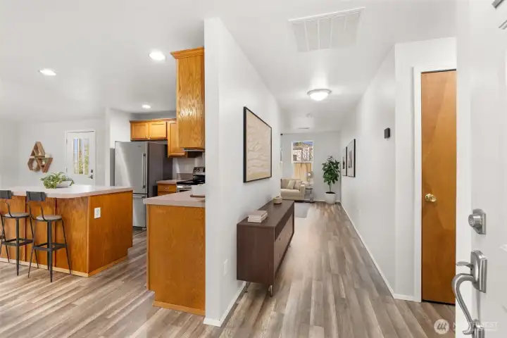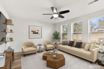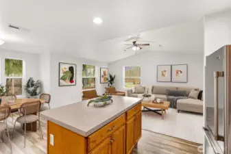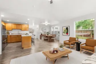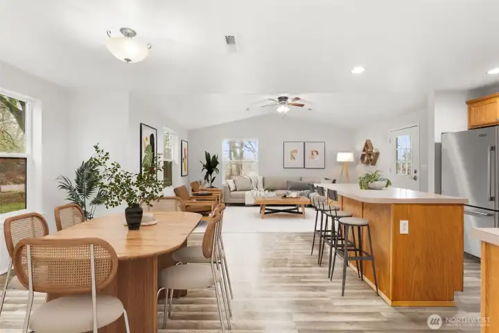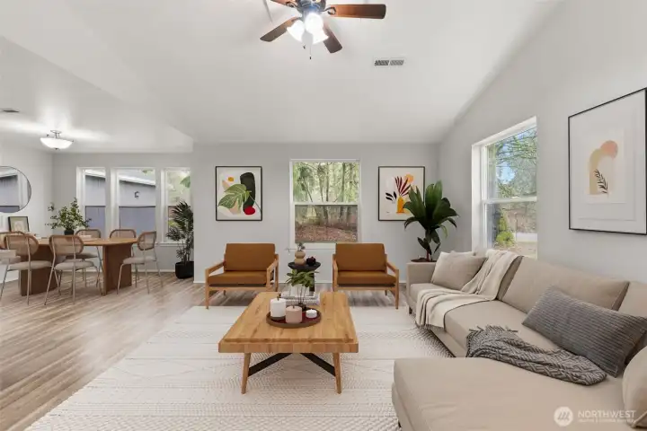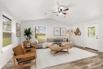Tucked away on 1.4 fully fenced acres, this beautifully updated home offers modern efficiency paired with true country living. The 3 bedroom, 2 bath Rambler features 1,580 square feet of thoughtfully designed living space with both a separate living room and a comfortable family room, creating flexibility for everyday living and entertaining. The kitchen is open to the family and dining areas with quick access to covered deck, making it ideal for gatherings, while the separate living room provides a quiet retreat. Recent improvements include new interior and exterior paint, new flooring throughout, and a new deck perfect for enjoying the peaceful setting. Energy-conscious upgrades include a geothermal heat pump, commercial-grade heat pump water heater, SPAN smart electrical panel with real-time energy management, and generator-ready wiring with manual transfer switch. A private well, whole-house water filtration system, and 5-bedroom septic offer long-term flexibility. Outdoor amenities shine with RV parking featuring 30 & 50 amp power, water, and septic hookups, plus a greenhouse, orchard, berry patch, raised garden beds with water line, chicken coop, and a shed with storage loft—ideal for those seeking space, sustainability, and a self-sufficient lifestyle.