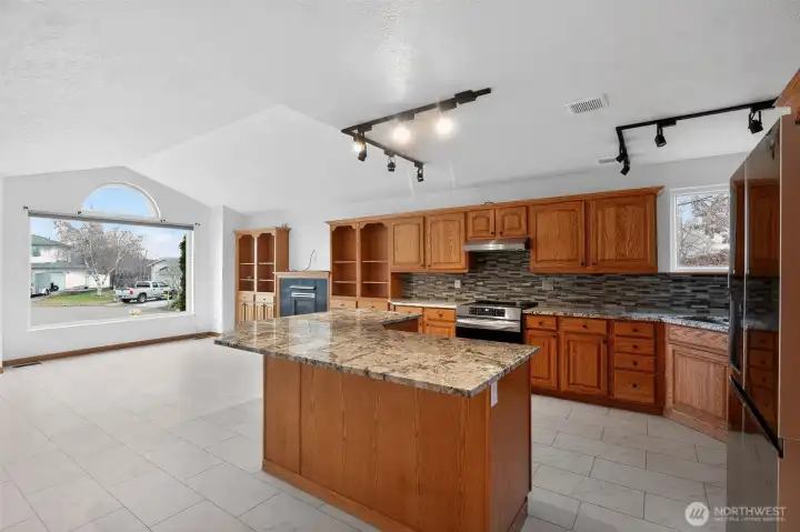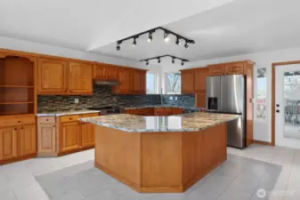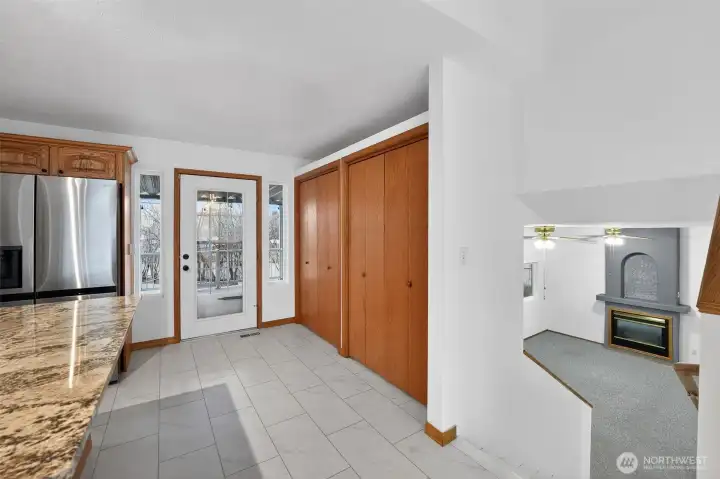 Spacious and versatile three-level home offering 5 bedrooms and an inviting layout designed for both comfort and functionality. The main level features an open-concept kitchen and living room with generous space to gather and entertain. The living room showcases an oversized window overlooking the front yard, a cozy fireplace, and custom built-in features that add character and charm. The kitchen is a true highlight with a large island, granite countertops, beautiful finishes, and abundant storage, plus direct access to the back deck for easy indoor-outdoor living. The lower level offers a comfortable dining room with wall-to-wall carpet and its own fireplace, creating a warm and welcoming space for meals and gatherings. Bedrooms are thoughtfully arranged, including one bedroom with hardwood floors, built-in features, and a ceiling fan—perfect for a home office. All remaining bedrooms feature plush wall-to-wall carpet. The primary suite provides a private retreat with an ensuite bathroom and walk-in closet. Outside, enjoy a large, fully fenced backyard with endless possibilities, with space for RV parking and RV hookup, complete with a covered patio, covered deck, spacious yard, a tool shed and a generously sized, 2 car garage, detached shop. This home offers exceptional space, multiple living areas, and a wonderful blend of indoor comfort and outdoor enjoyment.