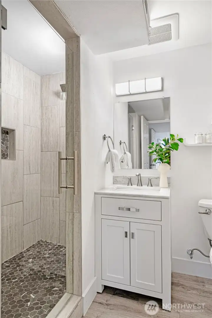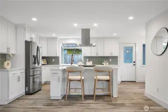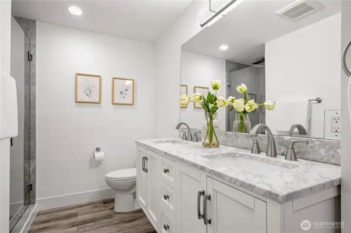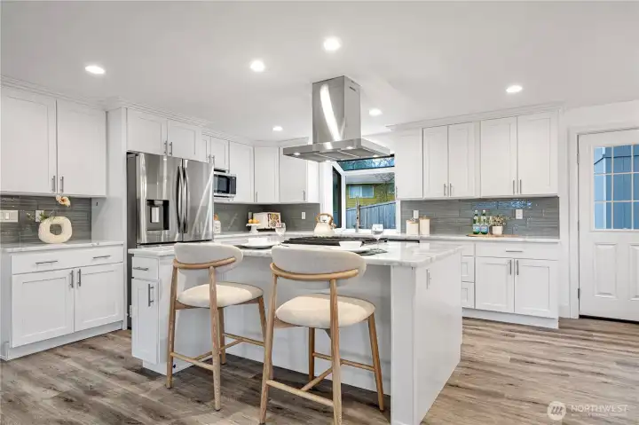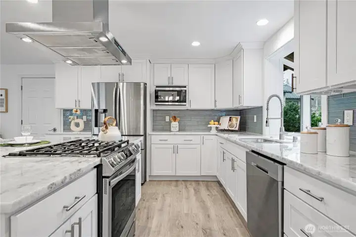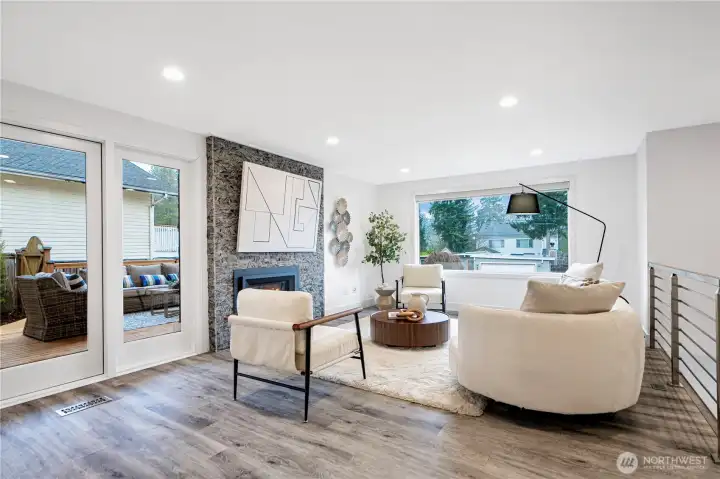 Welcome to this 2020 stunning remodel 2-story home flooded amid natural light. Chic interior invites you to a sun-drenched living room featuring a floor-to-ceiling stone fp and french doors opening to a large covered cedar deck. Dream white kitchen showcases expansive marble countertops with breakfast bar. Walk-in pantry and spacious dining room add favor to life, completed with access to 2nd deck. Primary suite boasts 5-piece bath & walk-in closet. First floor provides versatility with bedroom, shower, and rec room w/ kitchenette. Desirable layout w/ 3 showers suffice your needs. Perfect for outdoor/indoor entertaining. Fenced yard includes a large shed doubling as a workshop. Great location, close to Microsoft, schools, and Lake Samm.