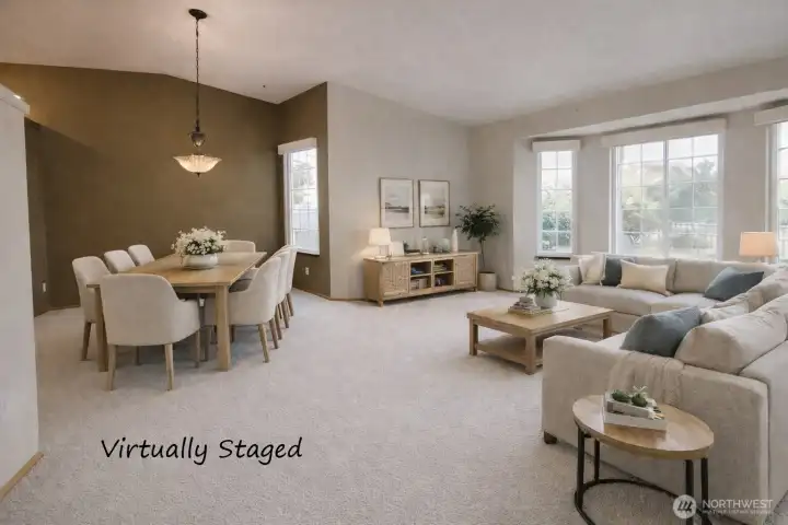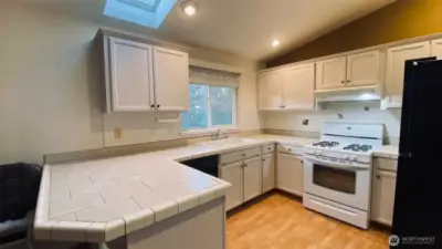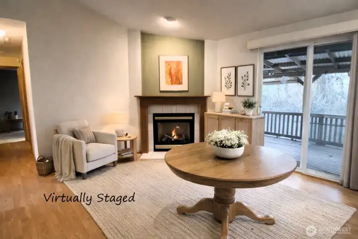 Charming Marysville rambler on a quiet cul-de-sac! Vaulted ceilings, skylights, and natural light create open ambiance throughout. The inviting great room with gas fireplace flows seamlessly from the kitchen, ideal for both everyday living and entertaining. Enjoy a generously sized primary bedroom and step outside to a covered back deck overlooking a tranquil greenbelt—offering privacy and serenity in the fully fenced backyard. Forced-air heating and cooling with a heat pump provide year-round comfort. New roof in 2023. All appliances stay. A wonderful opportunity to build instant equity in a desirable location near shopping, dining, parks & major commute routes. No HOA. Virtually staged to help you imagine the possibilities.