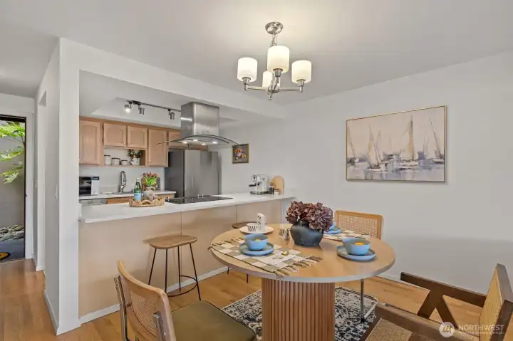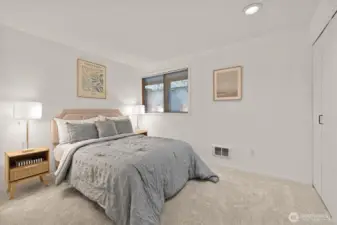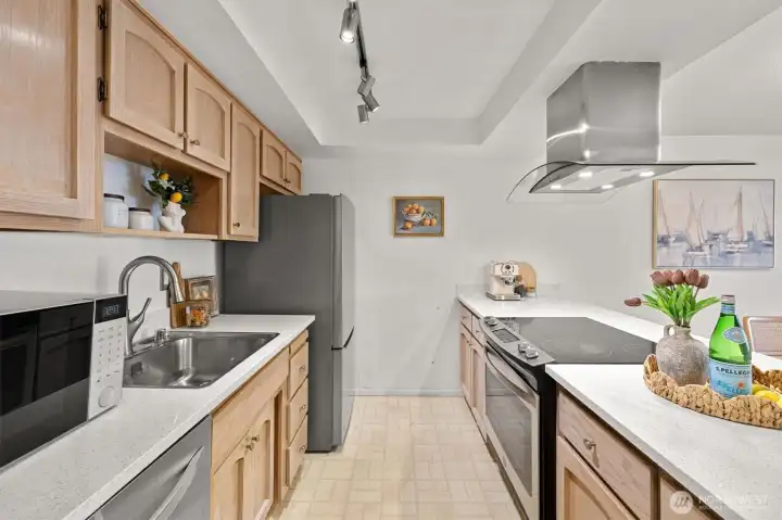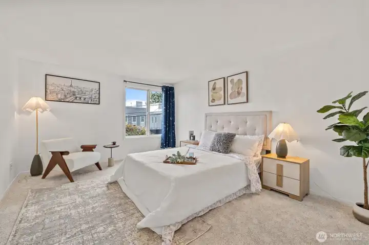 Enjoy peace of mind in this secure, gated building while experiencing the perfect blend of city convenience and quiet comfort in this west-facing home filled with natural light and open views. The spacious living area flows to a private balcony — perfect for morning coffee or sunset wine. Inside, find modern updates: quartz countertops, oak floors, newer carpet and refrigerator, plus a refreshed shower with marble-look tile. Everything you need is steps away — two storage spaces, recreation room, sauna, and outdoor pool are all on the same floor. With in-unit washer/dryer, covered & guest parking, HOA covering most utilities (even internet!), and close to tech hubs, Whole Foods, and Interbay Golf, this home makes everyday living effortless.