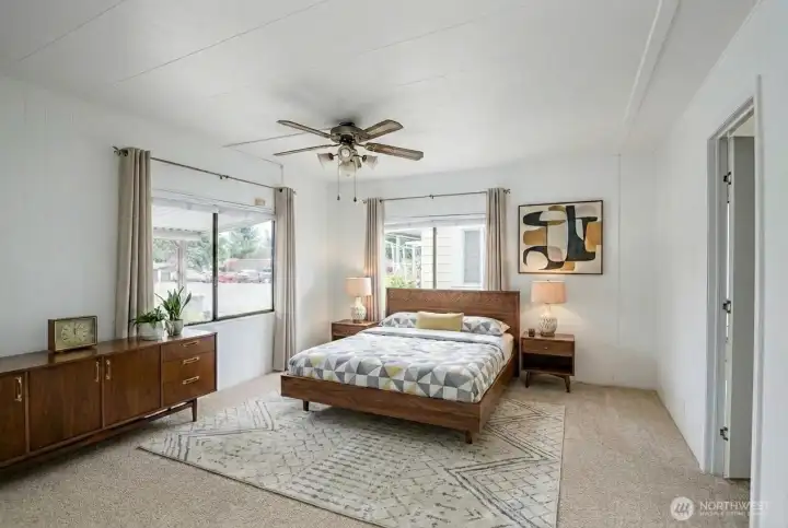 Location! That's what this house is all about in the 55+ Leisure Estates Park . This large 1536 SF home sits lengthwise with a view of the mini golf course. Many upgrades done inside & out. New carpet, vinyl, hot water tank, sump pump and full under house. Large living room, dining room, built in buffet, vaulted ceilings & sitting room off kitchen. Lg. primary bedroom w/4 pc bath, dbl vanities & storage galore! Lg. laundry w/desk. Backyard is gorgeous w/ full length garden. You have grapes, strawberries, blueberries, raspberries & a young Asian pear tree. Backs to a greenbelt, that's 60' of privacy! This lot is one of a kind. Full length pull thru driveway is a plus! Club house, pool, hot tub, fitness rm, dog park, pickleball. Virtually staged.