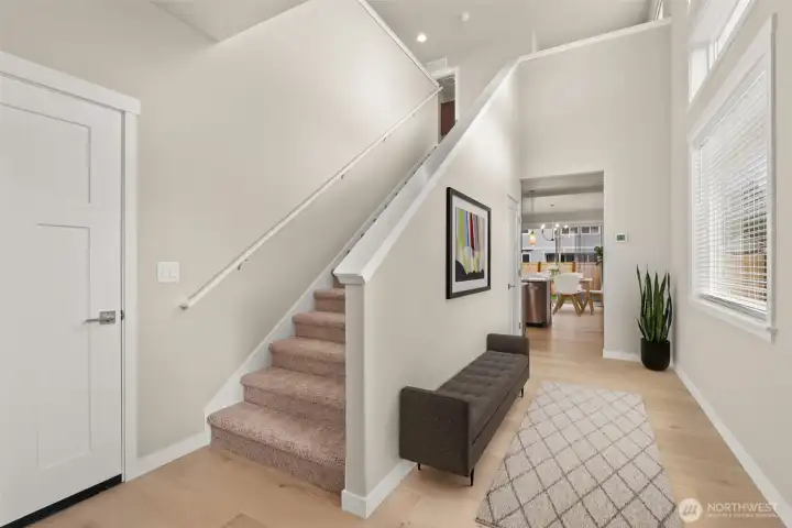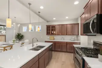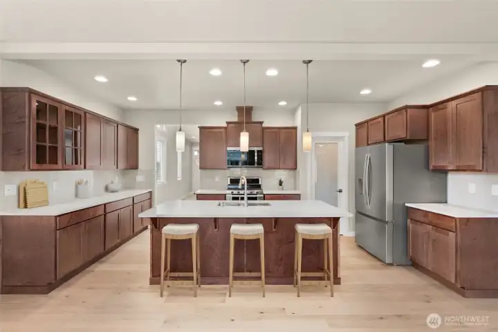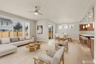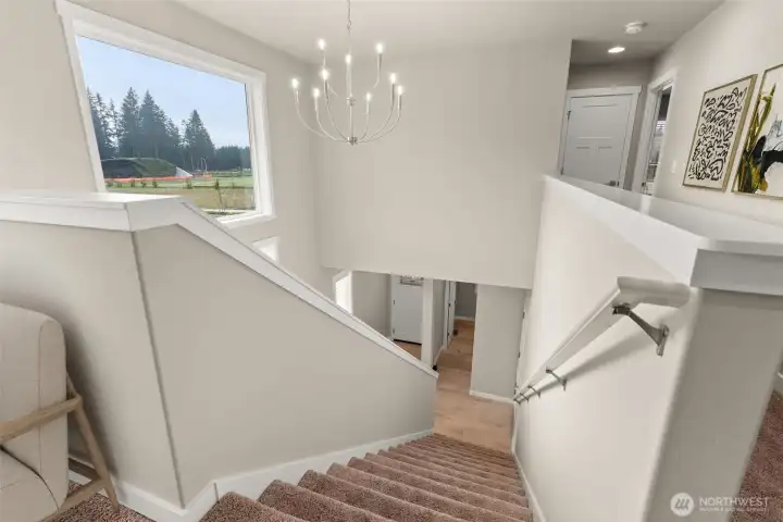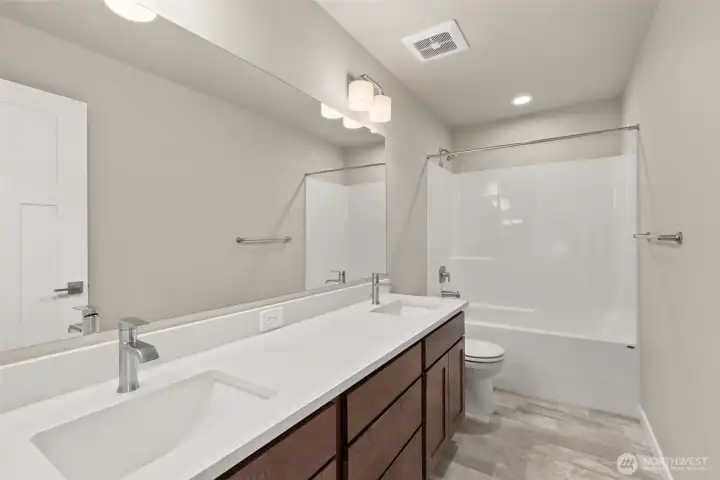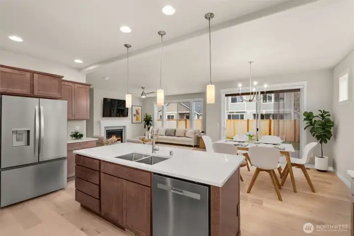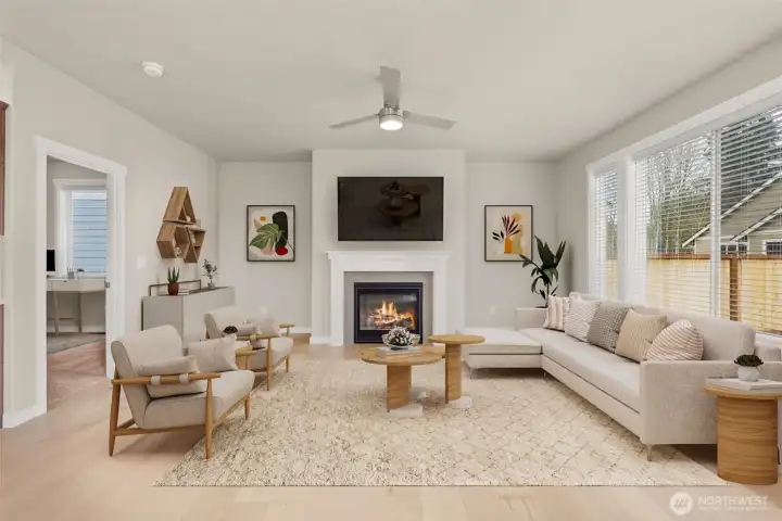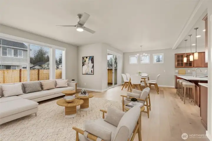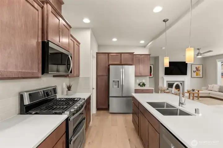 Move-In Ready and Designed for Comfortable, Modern Living. Welcome to Skyview Estates, where thoughtful design and everyday convenience come together. This home is move-in ready and includes washer, dryer, refrigerator & blinds, making your transition seamless. The chef-inspired kitchen features rich “Sable” Maple cabinetry, quartz countertops, a full tile backsplash, and a gas range with double oven—ideal for both entertaining and daily living. Expansive engineered hardwood floors flow through the light-filled main living areas, including a main-floor den and an upstairs bonus room offering flexible space for work, play, or guests. Step outside to the covered patio and enjoy a fully landscaped yard with privacy fencing, creating a comfortable outdoor retreat. Energy-efficient features such as solar panels, a heat pump, and a hybrid water heater provide year-round comfort and long-term efficiency. Built with quality and care by Rob Rice Homes and conveniently located near I-5 and Costco. Some images virtually staged.