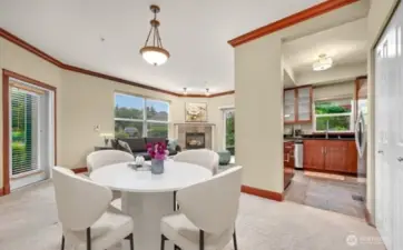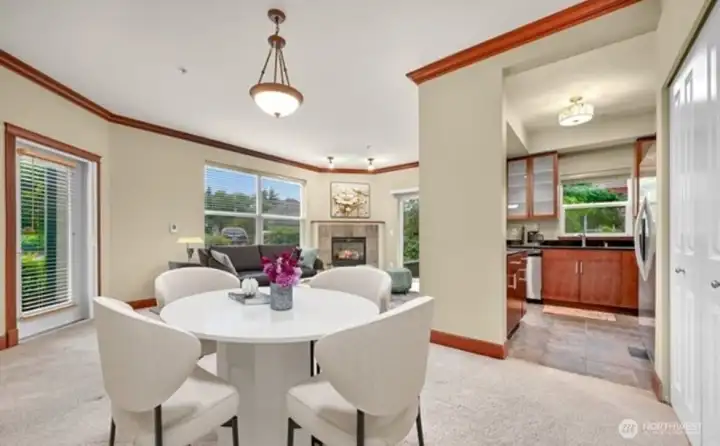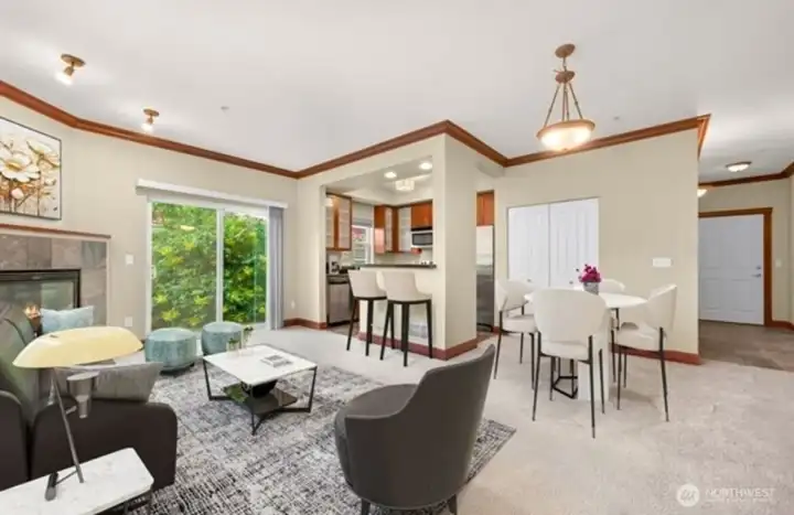 This stylish ground floor end-unit condo features 2 bedrooms and 2 bathrooms in a bright, open concept design. Enjoy a cozy gas fireplace in the living room, which flows seamlessly into the kitchen and dining area. This unit is unique, offering not one but two private patios—one off the living room and another from the primary suite—for your own outdoor escape. The primary bedroom includes an en suite bathroom with a double vanity. Building amenities include a secure lobby, underground parking, a fitness room, and a clubhouse. Conveniently located just minutes from Bellis Fair Mall, WCC, shops, dining, the Food Co-op, and WTA bus stops. No rental cap, making this an ideal opportunity for investors.