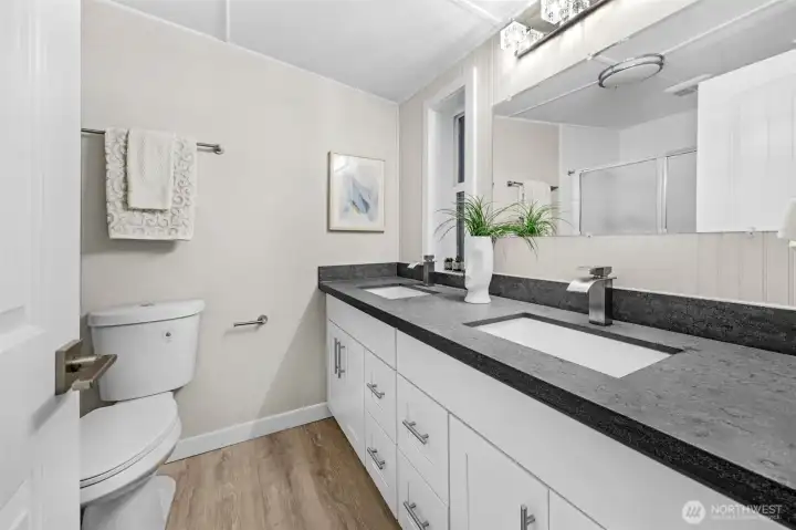 Fully Renovated one level Rambler featuring 2 Bedrooms, 2 Bathrooms + detached heated Office / flex space in the coveted Wandering Creek Estates (55+ community) where you own the land. This highly sought after floorplan offers a spacious open concept with a Chefs kitchen featuring new High End stainless appliances and Stylish Quartz countertops. New waterproof flooring throughout, new paint inside and out, new doors, millwork, hardware, professional landscaping, 2 upgraded bathrooms & more. Roof and windows were recently replaced. Don't miss the finished detached office/shop/craft room for your hobbies or storage. Covered Entrance with 2 car Carport. Woodcrest Community features include: Clubhouse, RV/boat parking, optional weekly groups activities. You are just minutes from shopping, coffee, restaurants, downtown Bothell and more. Full home inspection report & home warranty available.