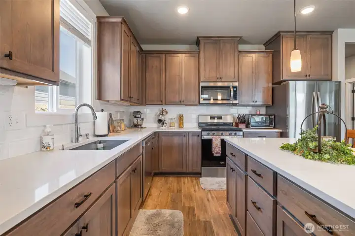Meticulously maintained move-in ready, in perfect condition, great curb appeal, and includes all appliances! Open concept kitchen, quartz counters, undermount sink, island/breakfast bar, pennant lighting, cabinet high back splash, staggered cabinets, soft close hardware, stainless appliances, gas range. Raised ceilings, electric fireplace, plenty of natural lighting. Nice separation between bedrooms, primary bedroom has large walk-in closet and large attractive bathroom. Cabinets and sink in laundry room. Finished garage, covered front porch, block fencing, fantastic outdoor living area, covered oversized back patio. Great neighborhood near beautiful Heights Park with gazebo, playground, trails, basketball court, soccer field and more.