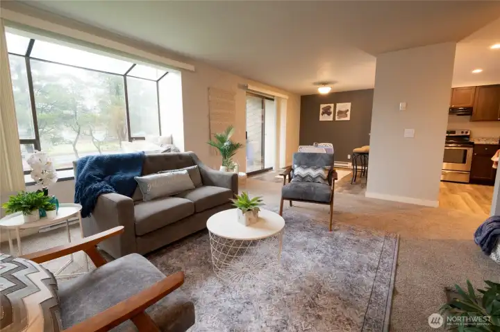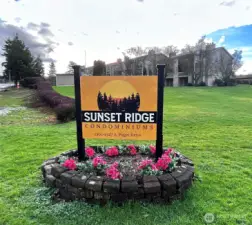 Spacious 2 bed/1.5 bath condo with open-concept layout, modern kitchen with granite counters, newer cabinets and LVP flooring. Bathroom is updated with tile surround tub, new cabinets and flooring. The spacious livingroom has a wet bar and features a wood-burning fireplace. Dining room opens up to deck with storage unit that looks out onto the community pool. The large primary suite has dual closets and private vanity. Prime unit location with views of pool, green space, and RV parking and has no rental caps. HOA covers water, sewer, garbage and community perks. Affordable, move-in ready—discover life at Sunset Ridge! Prime location with easy access to I-5/ I-405/HWY 167 shopping/ dining/ local parks and trails.