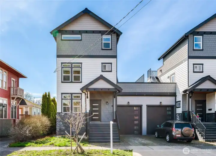 Welcome to beautifully built 2 story with basement stunning views, featuring multiple living areas and smart design. Located in downtown Bellingham, this home blends luxury, comfort, and versatility. The top floor offers a spacious bonus room with sliding glass doors leading to a large rooftop deck—w/ breathtaking views. AC on each floor. Enjoy fresh paint, hardwood floors, and quartz countertops.Second floor includes two ensuite bedrooms, master bedroom with view, lower level features a separate living area, bedroom, full bath, and its own washer/dryer—ideal for a guest suite, rental, or multi-gen living. A huge garage with tall ceilings, and additional washer/dryer. More parkings on driveway. Live and Rent. Welcome Home!