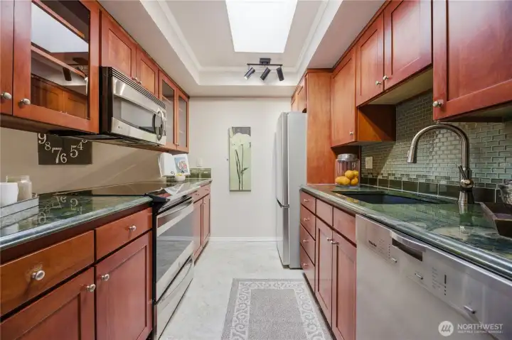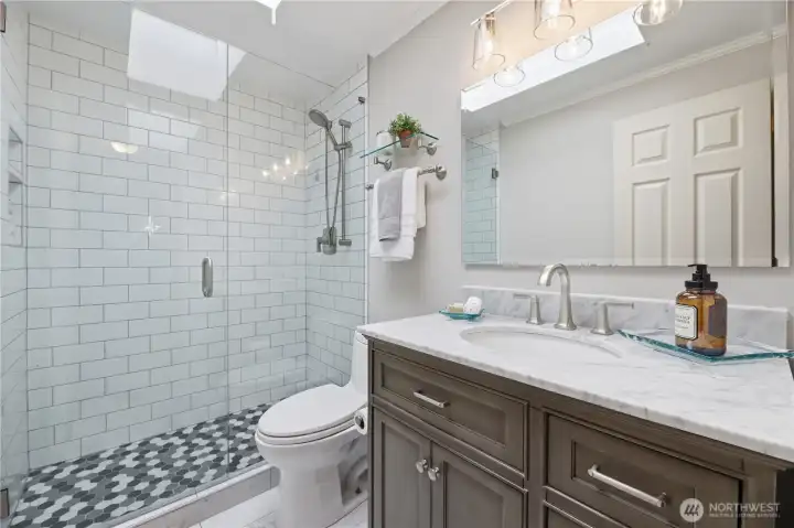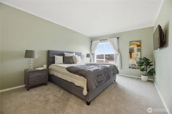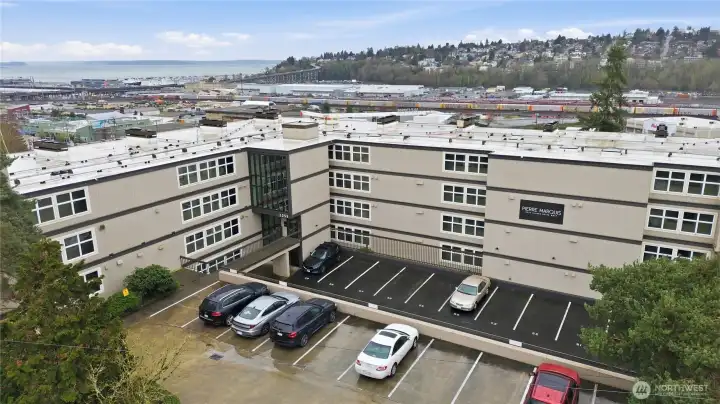 Experience elevated living at the sought-after Pierre Marquis, an exceptional top-floor residence in the heart of Queen Anne. This beautifully remodeled 2-bedroom, 2-bath home offers a perfect blend of modern style and everyday comfort, illuminated by natural light from overhead skylights. Step inside to discover a spacious interior featuring all new appliances, new flooring, and carpets throughout, complemented by a versatile zone heating system for personalized climate control. The primary suite is a true retreat, boasting a huge closet, a generously sized bedroom, and a stunning, updated bathroom. Relax on your private balcony and watch the ferries and cruise ships glide across the water, all while taking in breathtaking sunset views of Elliott Bay. Residents enjoy the peace of mind provided by a 24-hour on-site property manager and a well-funded HOA, along with a premier covered parking spot and an extra-large storage closet located just outside the unit. Ideally situated near dog-friendly parks, shops, and dining, this home combines convenience and location in one exceptional package. Common area amenities include: pool and sauna, game room with meeting space with kitchen and dedicated additional storage.