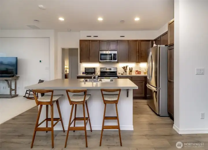 Welcome to refined living in Tehaleh’s 55+ neighborhood. This 2-bed, 2-bath home features an open-concept layout with modern finishes and abundant natural light. Energy-efficient upgrades including solar panels and EV charging provide both convenience and long-term value. The kitchen features contemporary cabinetry, under cabinet lighting and a streamlined flow into dining and living areas, creating an effortless setting for daily living. The primary suite includes an ensuite bath and walk-in closet for added comfort and privacy. Residents enjoy access to an exceptional collection of amenities including a clubhouse, fitness center, indoor pool, pickleball courts, trails, thoughtfully designed gathering spaces and more.