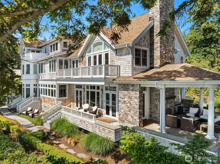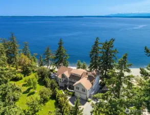 Quintessential Coastal Living on Mutiny Bay. Enjoy sweeping western views & the ultimate in privacy from this beachside retreat. Incredible craftsmanship over 6,100 sf of gracious living. A floor plan designed to entertain & host friends. Expansive great room, kitchen & family room with awe-inspiring views of water & the Olympic mtns. Dining room for 10+, covered outdoor living. Relax fireside as the sun sets. Hot tub, firepit & the coveted wide, sandy beach for endless play & chasing the sun. Four bedroom view suites, including luxurious primary w/vaulted ceilings, fireplace & deck. Upper level with spacious exercise room, spa, deck & loft. Media room & more. Nothing missing at this incredible estate where every day is a vacation.