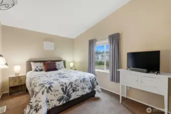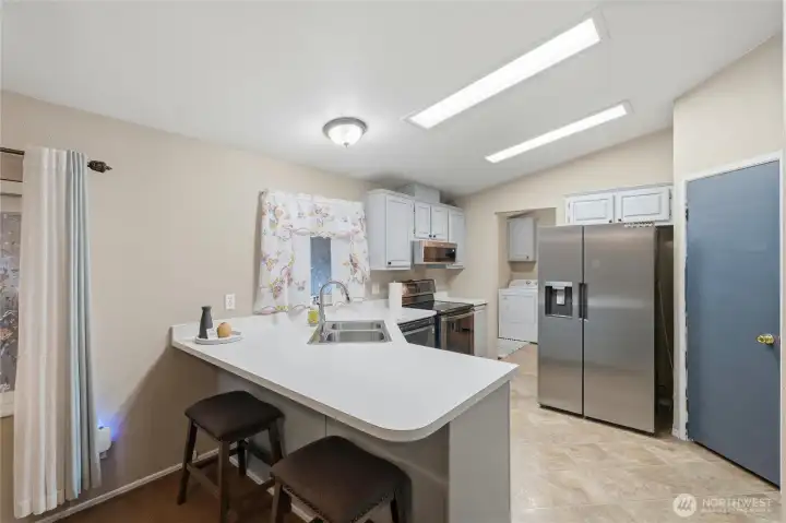 Welcome to this lovely 3-bedroom, 2-bath home offering 1,404 sq ft in a desirable 55+ community. Vaulted ceilings throughout create an open, airy feel and enhance the spacious layout. The bright kitchen features stainless steel appliances, a generous pantry, built in hutch and two eat-in bars—ideal for everyday living or entertaining. The large primary suite includes a private en suite and an impressive walk-in closet. Additional highlights include a new heat pump in 2024, a garage with shop space, extra shelving, and electrical, along with a low-maintenance yard and fully fenced backyard—perfect for relaxing or outdoor enjoyment. This well-cared-for home offers comfort, functionality, and convenience in a welcoming community.