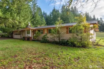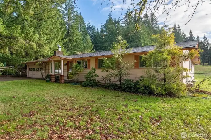 Peace, Quiet & Seclusion Awaits! This single-story ranch home is nestled in a beautiful private setting of old-growth trees. The home is situated on 5 acres with a 4-Bay metal shop, plenty of extra parking, garden space, a 2-car attached garage, and a spacious covered patio. The home has had some recent updates. The living room features a wood-burning fireplace with a brick mantle, recessed lighting, and new LVP flooring that extends throughout the main living areas. The kitchen showcases custom oak cabinets complete with lower pullout shelving and spice cabinets. Also featured are under-cabinet lighting, tile flooring, & a breakfast nook. The primary bedroom features a walk-in closet and an attached full bath with tile flooring, a marble countertop, & a solar tube. Recent updates include new flooring, fresh paint, and a new roof. Schedule a personal viewing appointment today! An additional five acres is available!